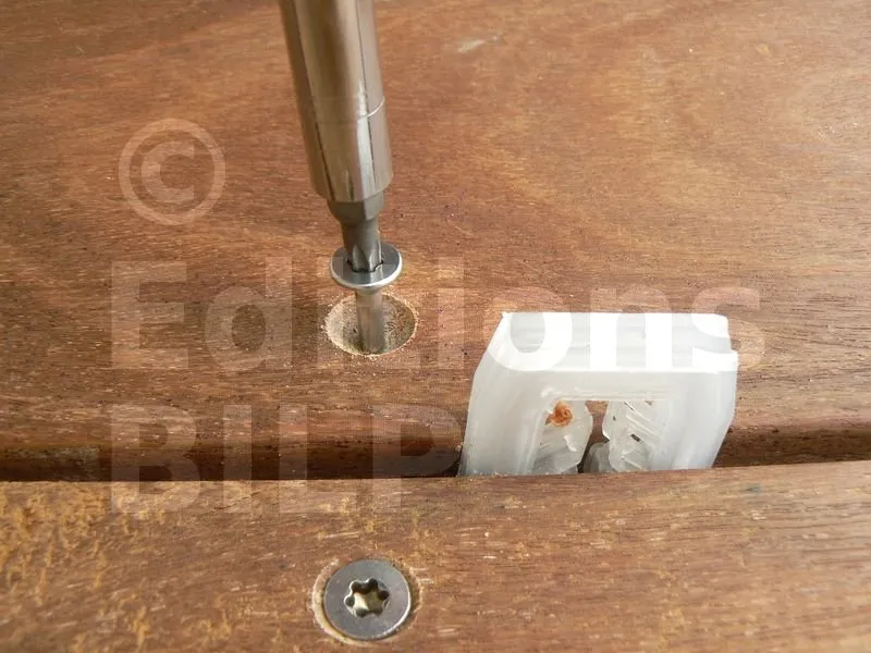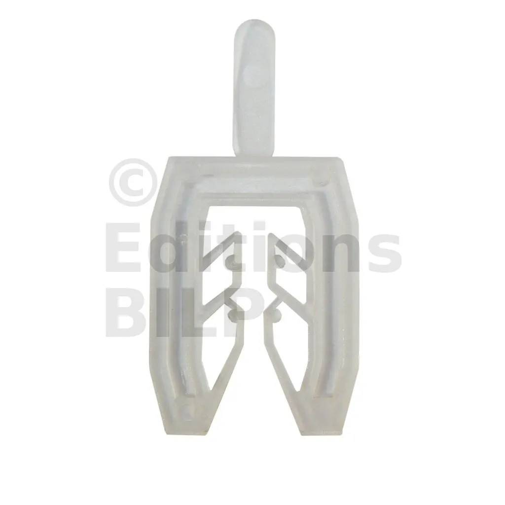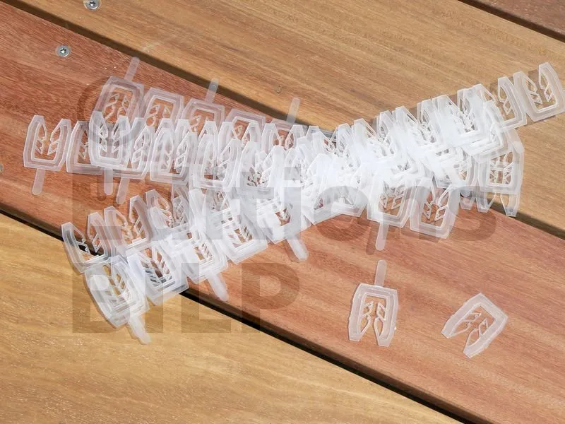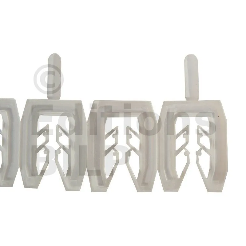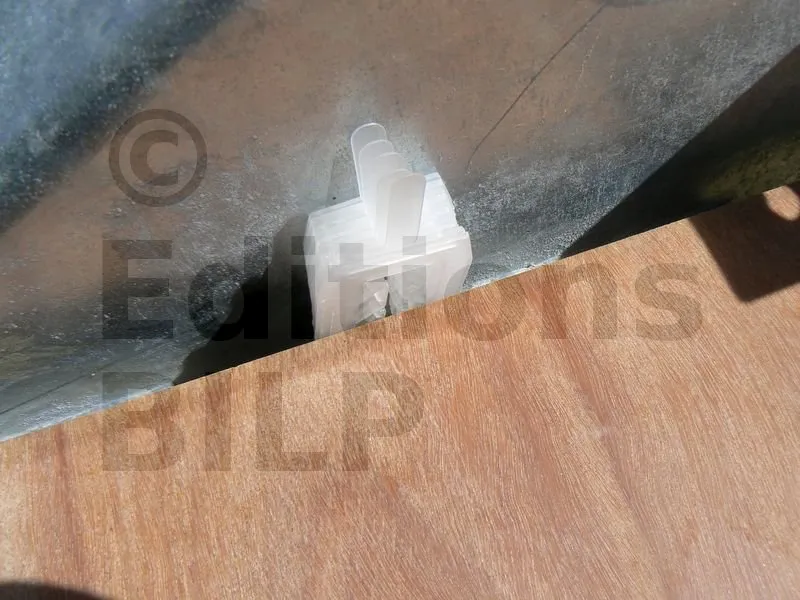 Chaque cale comporte un peigne intérieur (ou fourchette) qui permet de clipser la cale, ou un ensemble de cales, sur une vis. On peut clipser efficacement sur des vis, ou tirefond, ou tige filetée, de diamètres allant de 3 à 9 mm. Ainsi, la cale reste sur son support même si celui-ci bouge. La moitié des cales comporte une petite languette qui vous permettra de l’insérer et la pousser facilement sous un espace restreint, sous une lambourde par exemple.