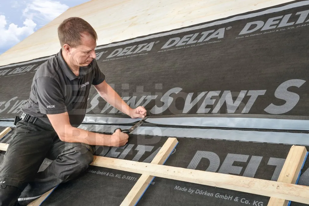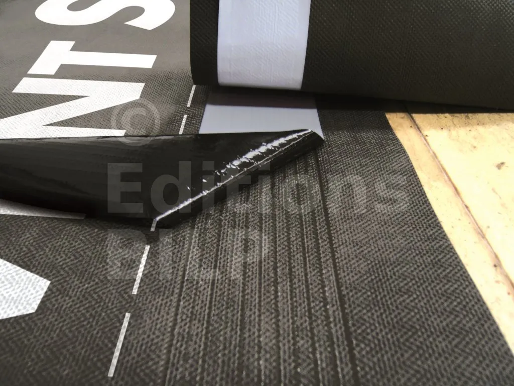 - MatériauÉcran de sous-toiture et pare-pluie tricouches PP composé de deux non-tissés en monofils continus désorientés, d'un film respirant avec deux bandes autocollantes intégrées.