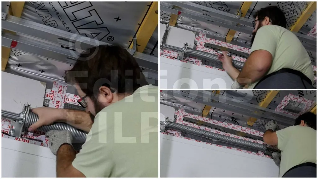 D’abord les ressorts doivent être clipsés ou vissés sur leurs supports (parachutes), selon les instructions du fournisseur. Ensuite, tracez une ligne horizontale sur les ressorts. Généralement, il y a une ligne horizontale pré-tracée sur les ressorts, réalisez-le avec un marqueur. Puis, à l’aide des deux barres de tensions fournies avec la porte, réalisez la torsion en insérant les barres dans le mandrin des ressorts puis en les tournant. Ne lâchez jamais les deux barres en même temps pour éviter des accidents provoqués par la force des ressorts, toujours une à la fois. La bonne tension des ressorts est obtenue lorsque la ligne horizontale tracée précédemment forme des diagonales. Le nombre de ces diagonales est mentionné dans la fiche du produit. Une fois la tension des ressorts obtenue, serrez les vis sur les ressorts sans relâcher la tension pour les bloquer avec l’axe. Enfin, retirez les pinces étaux sur les tambours posé lors de la mise en tension des câbles.