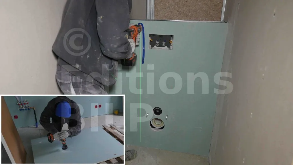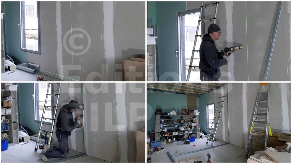 L’implantation consiste à tracer avec précision l’emplacement du mur afin d’assurer son alignement et son équerrage. À l’aide d’un mètre à ruban, d’un feutre et d’un laser, commencez par marquer l’axe du mur au sol, puis projetez son alignement au plafond. Identifiez les ouvertures et dégagements en vérifiant les dimensions à chaque étape. Pour contrôler l’équerrage, appliquez la règle de 3/4/5 : mesurez 3 unités sur un côté, 4 sur l’autre, et assurez-vous que la diagonale mesure 5 unités. Une implantation précise facilite la pose des rails et garantit un montage optimal du mur en placo.