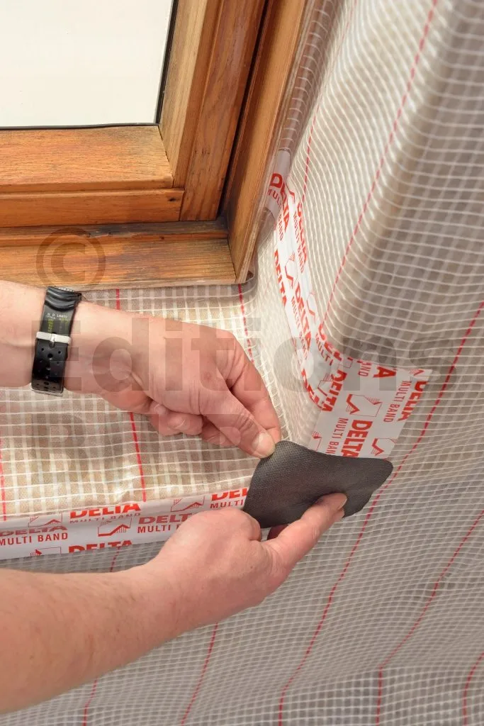 2. Le collage de DELTA®-FLEXX BAND nécessite l’emploi du primer DELTA®-PREN lorsque DELTA®-FLEXX BAND est utilisé comme support de plâtre, humidifier le géotextile. Fixer mécaniquement en quinconce tous les 10 cm.