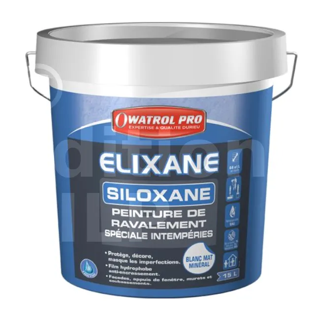 ELIXANE est une peinture de ravalement de façades type D2 à base de résines siloxanes en dispersion aqueuse. Dotée d’un excellent pouvoir masquant, elles protège et décore les façades neuves ou à entretenir/rénover, les salissures et l’encrassement atmosphérique ne peuvent pas se fixer, les pluies battantes ruissellent sans pénétrer grâce au film hydrophobe.