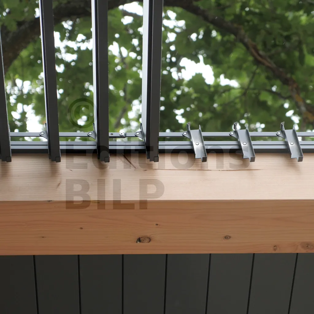 Fixation invisible : Les mécanismes sont assemblés entre eux par un embout spécial, lui même fixé sur le support (poutre de la pergola par exemple). La fixation doit être de diamètre 5mm, en INOX. Sa longueur et sa nature dépendent du support :