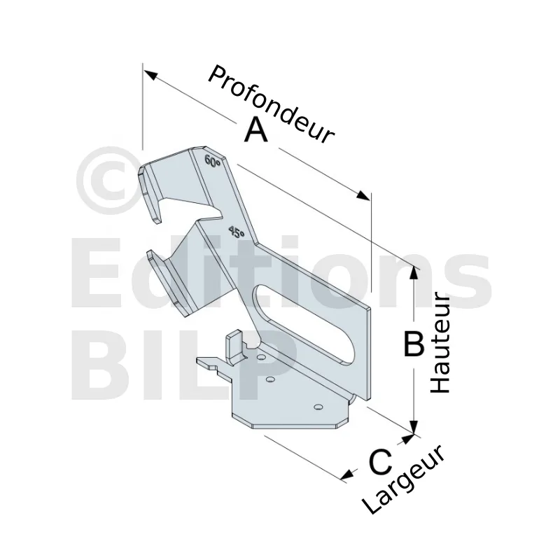 - Ce gabarit trouve son utilité avec les gammes de vis filetage total ou vis sarking car l’angle de vissage est majoritairement à 45° ou à 60°. Il peut toutefois être utilisé pour n’importe quel type de vis de longueur supérieure à 100 mm pour une configuration à 45°, et supérieure à 140 mm pour une configuration à 60°.