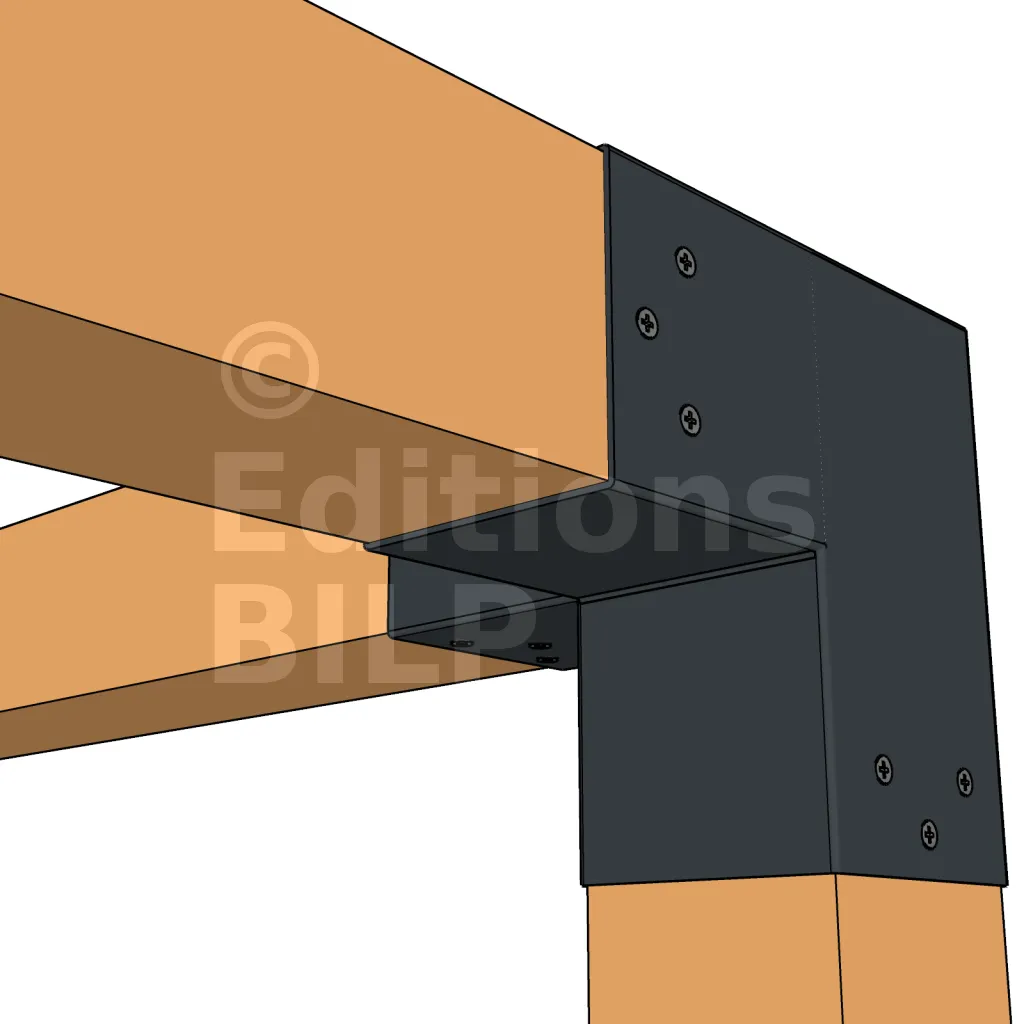 Il est utilisé dans un angle extérieur. Ce connecteur va permettre de raccorder une poutre 90x90mm perpendiculairement à une poutre 90x90mm, le tout étant supporté par un poteau vertical 90x90mm.