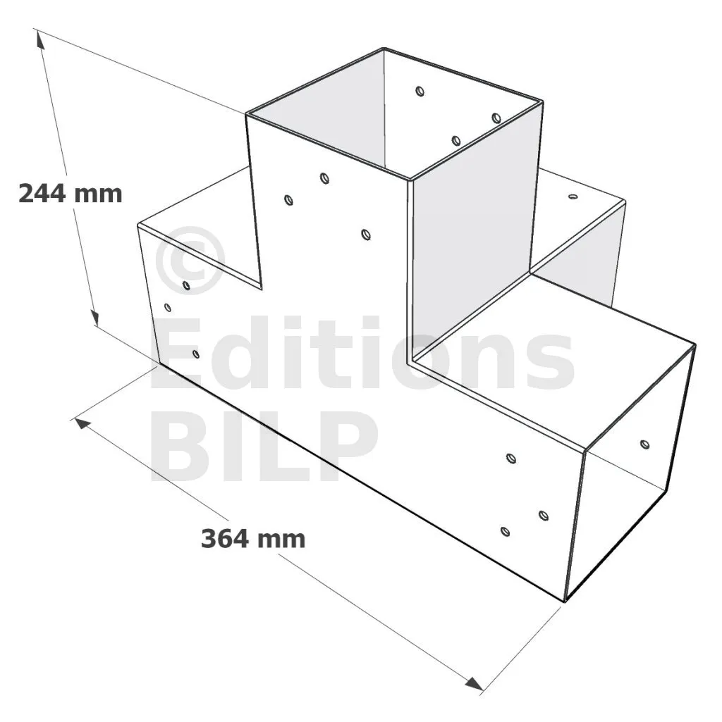 Il permet de raccorder une poutre de 120x120mm perpendiculairement à un chevron de 120x120mm, le tout étant supporté par un poteau vertical de 120x120mm.