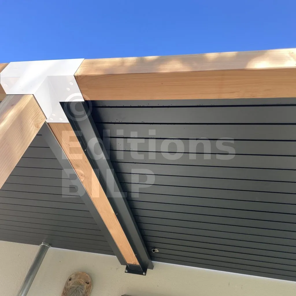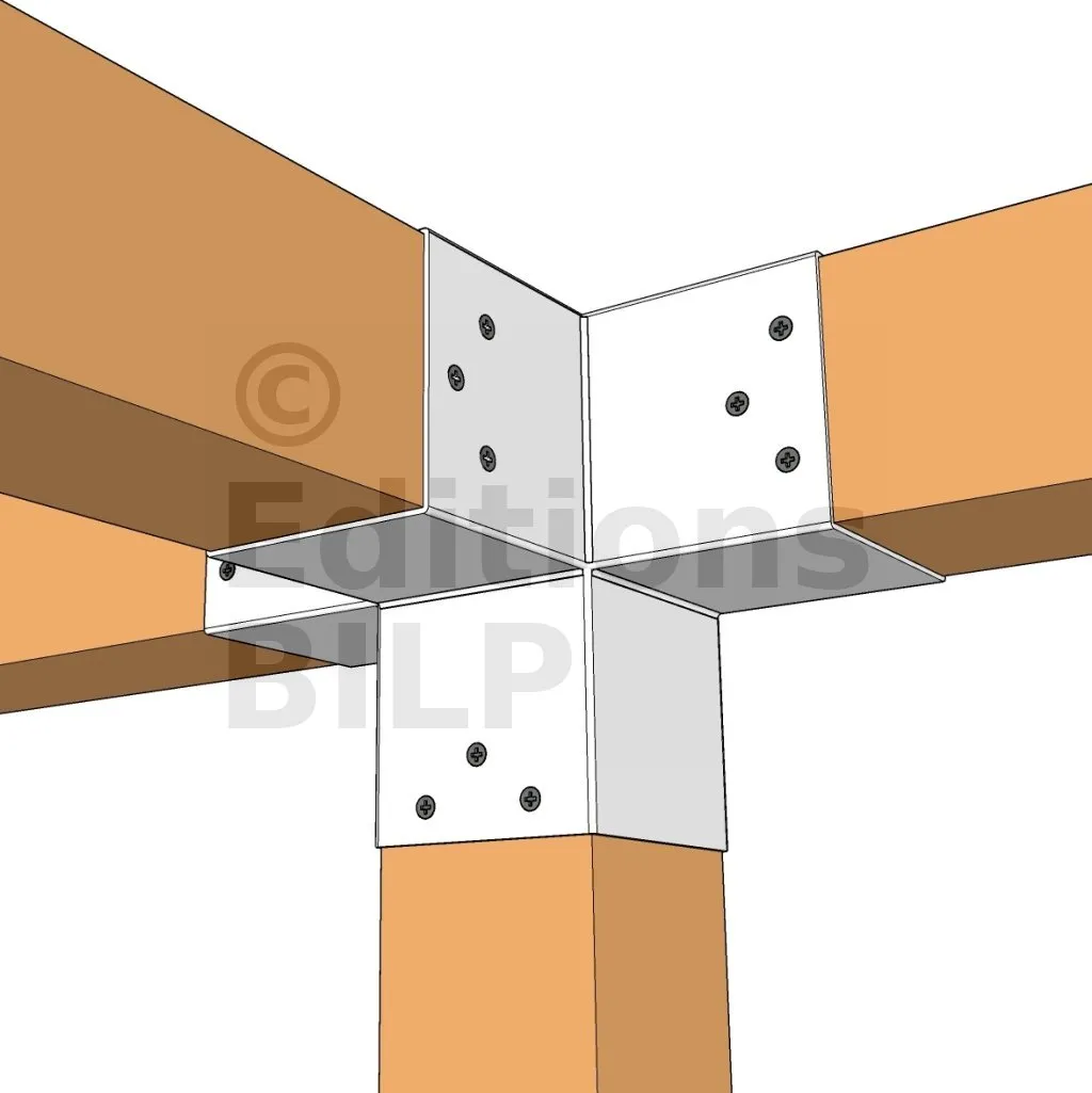 Il permet de raccorder une poutre de 90x90mm perpendiculairement à un chevron de 90x90mm, le tout étant supporté par un poteau vertical de 90x90mm.