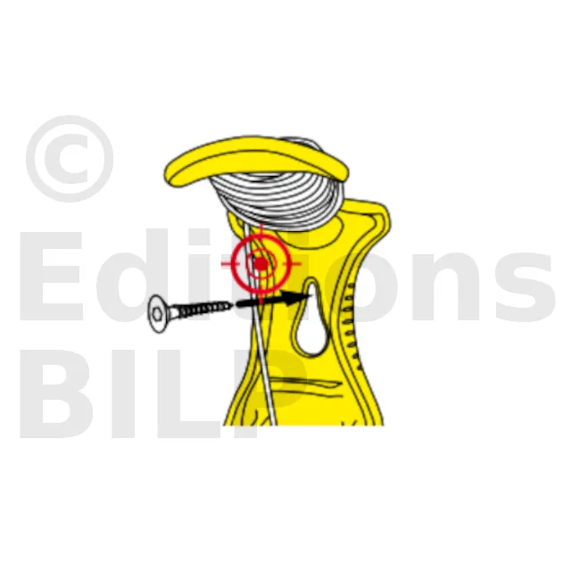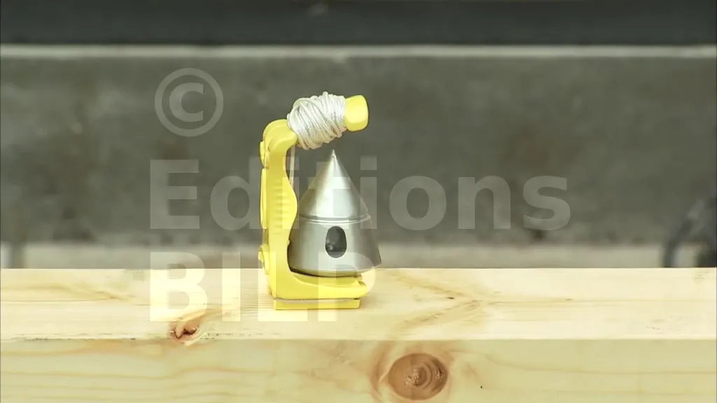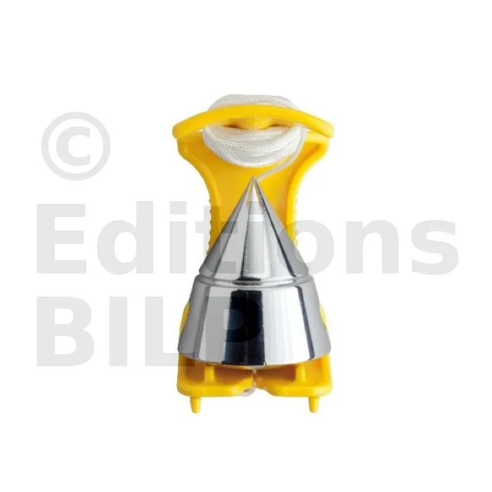 - d’une monture en polymère perforée de couleur jaune vif. La perforation permet de le fixer à une vis, des clous ou autres et de libérer la main de l’utilisateur, tandis que la couleur facilite son identification sur le chantier.