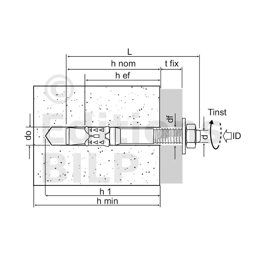 | Références | Référence produit | Dimensions [ØxL] [mm] | Ø perçage [d0] [mm] | Prof. min. de perçage [h1] [mm] | Ø perçage dans pièce à fixer (au travers) [df] [mm] | Ouverture de clé sur plat [SW] [mm] | Couple de serrage [Tinst] [Nm] | Prof. ancrage [hef] [mm] | Ep. mini du support [hmin] [mm] |