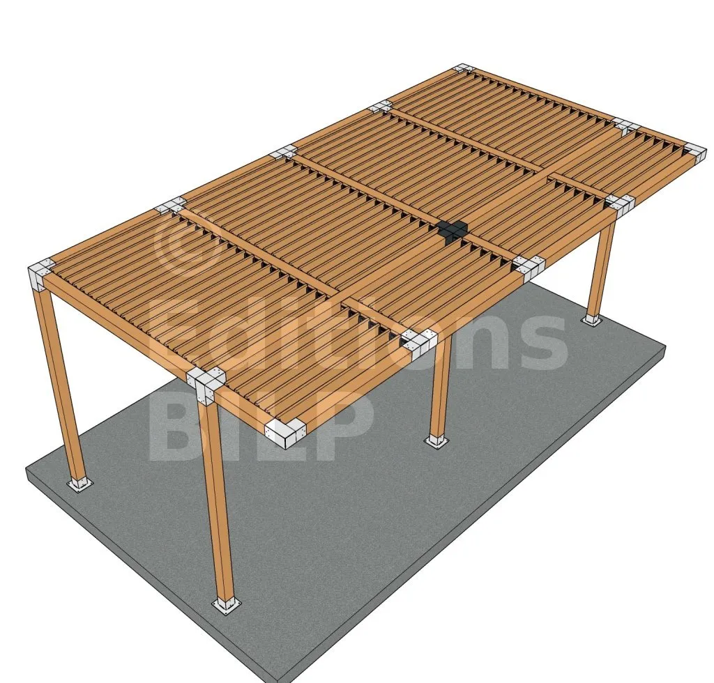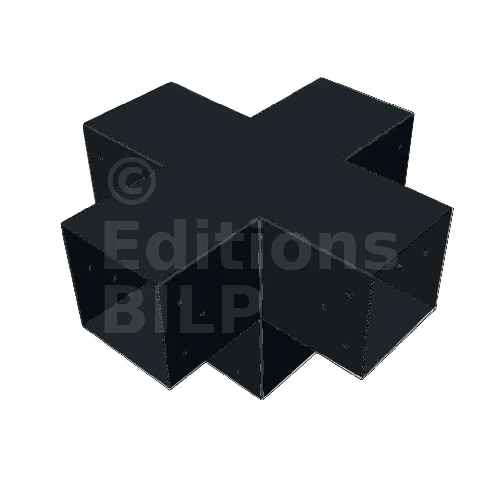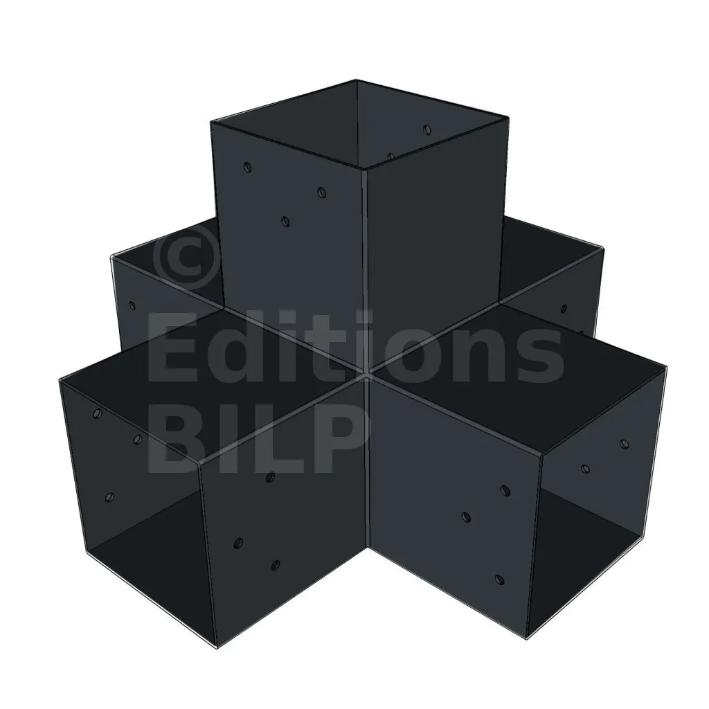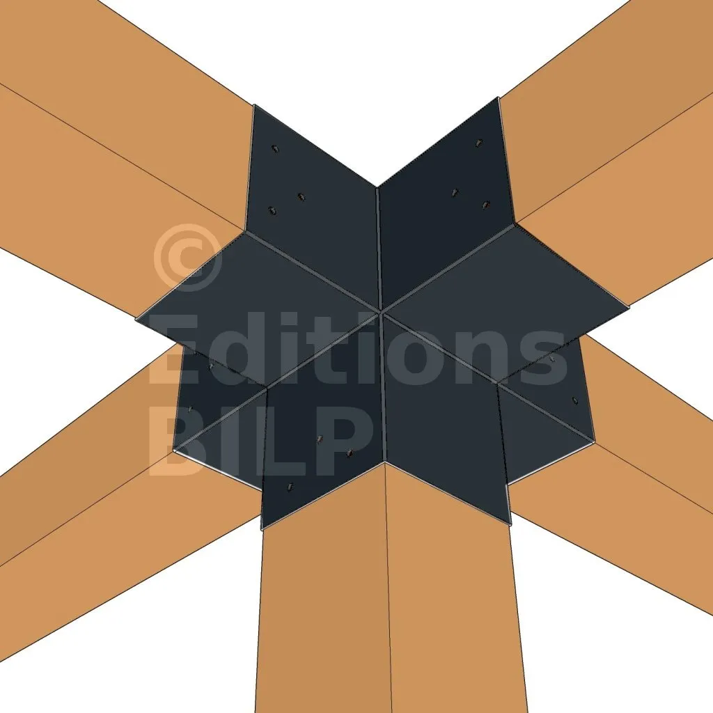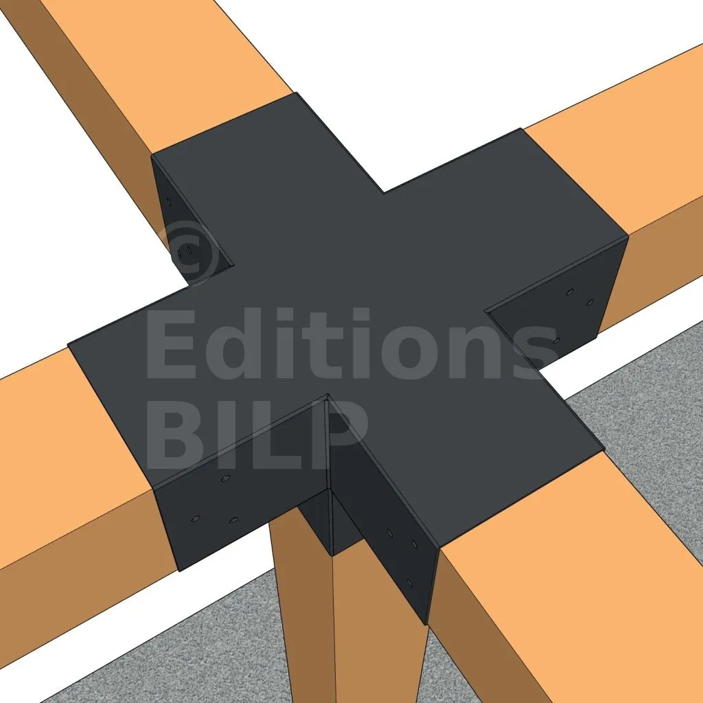 Il permet de raccorder deux poutres 120x120mm perpendiculairement à une autre poutre 120x120mm, le tout étant supporté par un poteau vertical de 120x120mm.