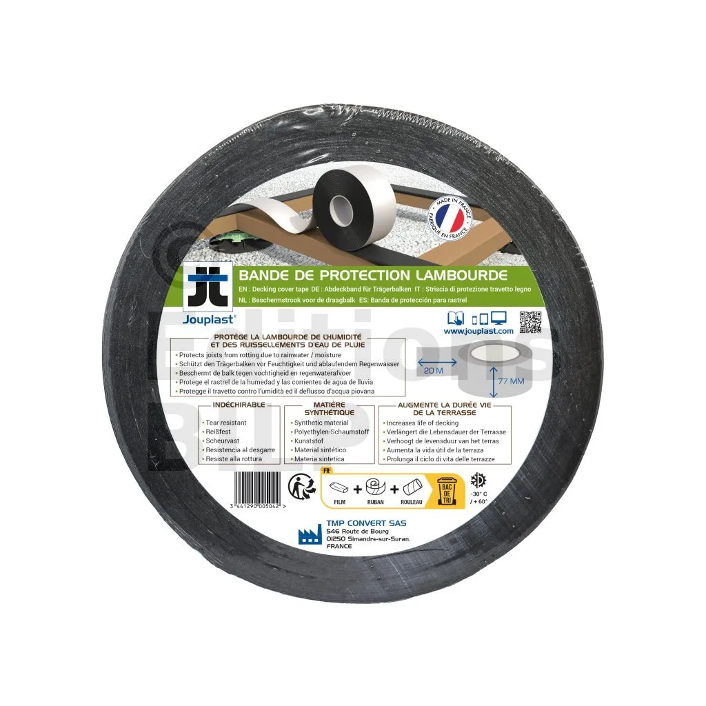 Cette bande a pour rôle d’étanchéifier les lambourdes constituant la structure de votre terrasse pour rendre votre ouvrage plus pérenne. En effet, les ruissellements des eaux de pluie ne vont plus s’attaquer aux lambourdes, ce qui évitera le pourrissement de ces derniers.