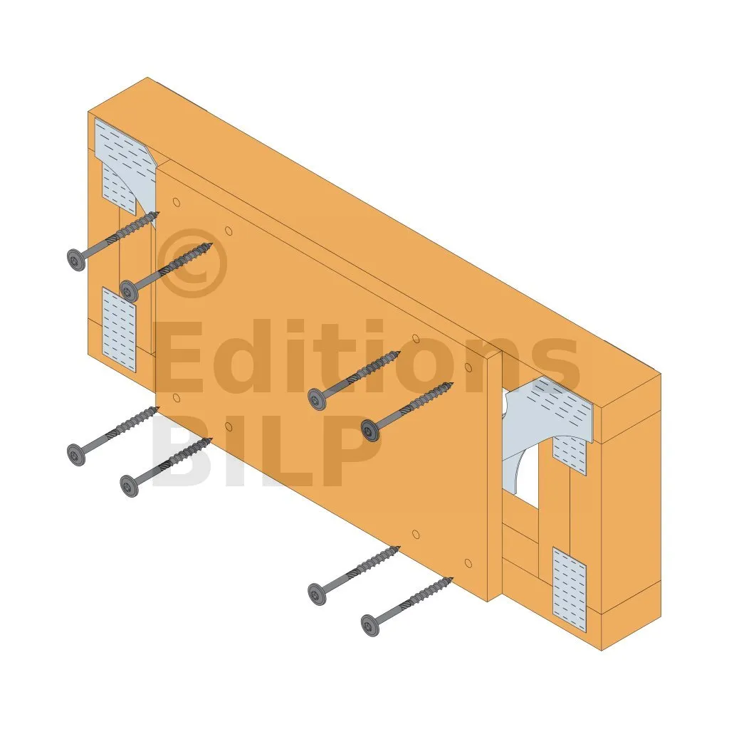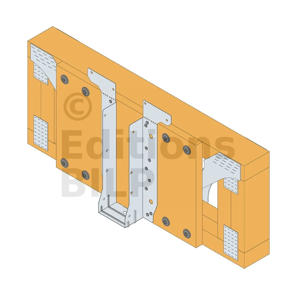- L’installation optimisée nécessite de fixer un bloc de renfort en contreplaqué de 18 mm sur la face de la poutre métallique ajourée. Ce bloc doit avoir une largeur minimum de 400 mm et une hauteur correspondant à celle de la poutre métallique. Il est installé avec 8 vis ESCR8.0x80mm, positionnées conformément à l’illustration dans la section "Notes d’installation".