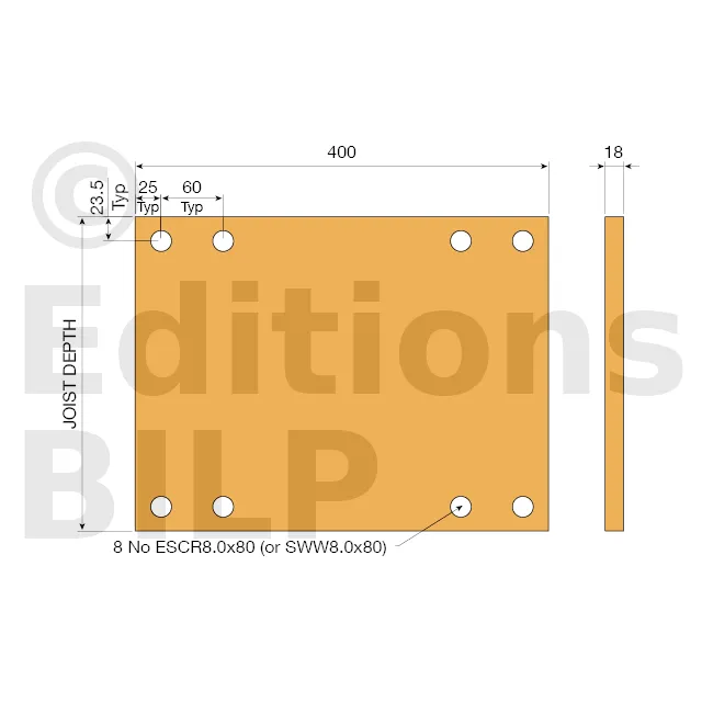 1. Cas d’une poutre porteuse métallique ajourée : installer une plaque en contreplaqué de 18 mm sur la face de la solive à âme métallique. Cette plaque doit avoir une longueur minimum de 400 mm et couvrir toute la hauteur de la solive à âme métallique. La plaque en contreplaqué est installé avec 8 vis ESCR8,0x80mm, positionnées conformément à l’illustration ci-dessous,