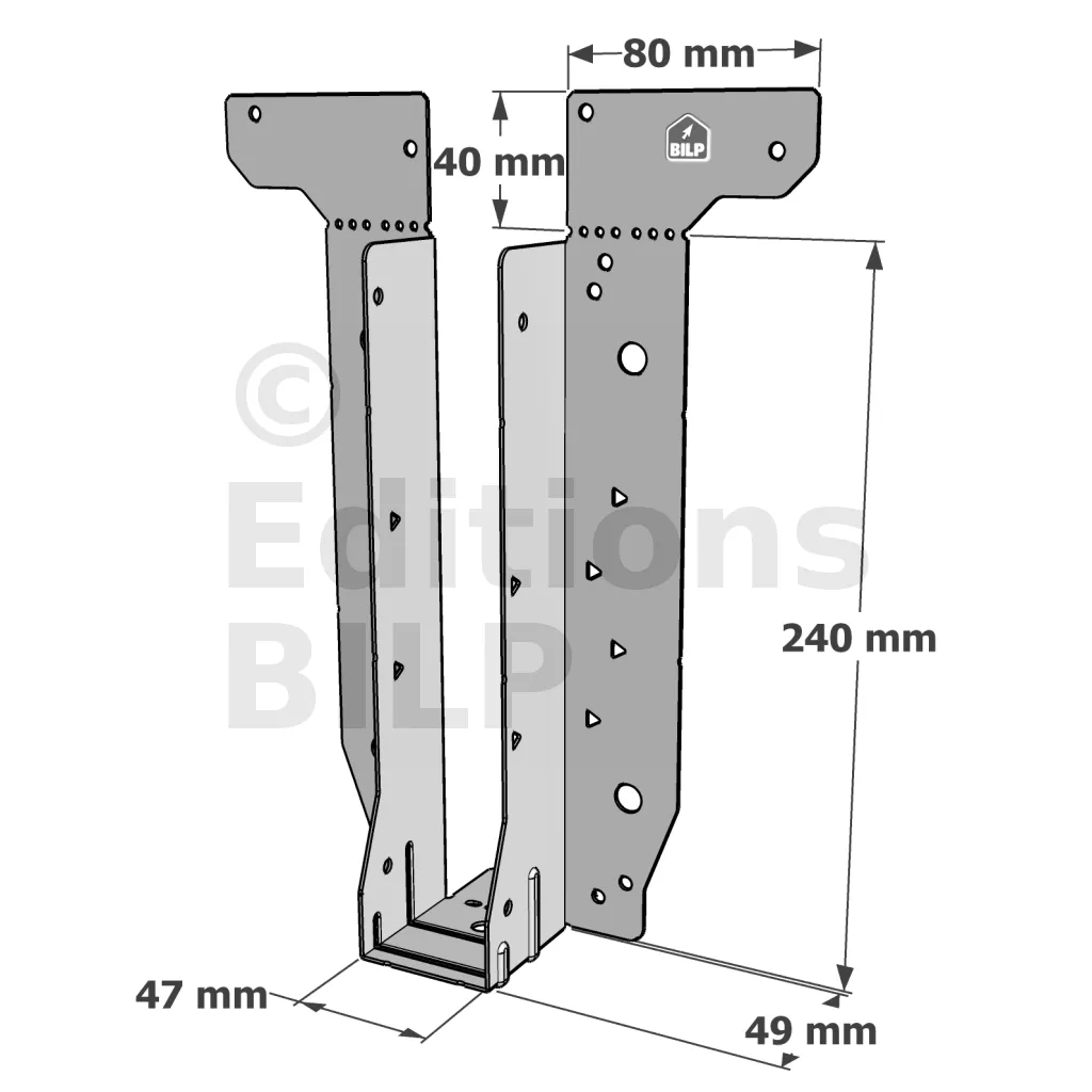 - Étrier fourni avec ses brides supérieures droites, pliables sur chantier afin de s’adapter à toutes les hauteurs de solives,