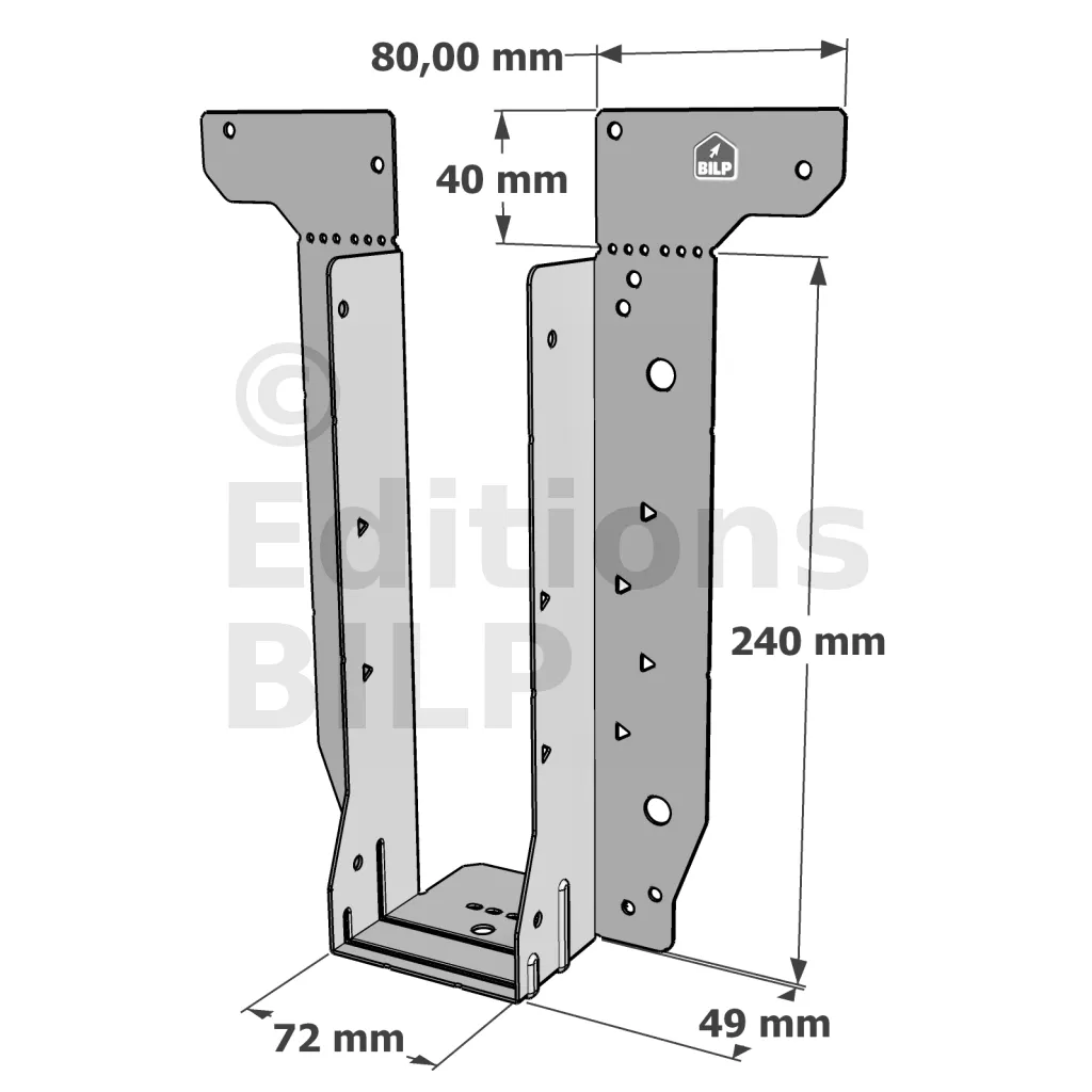 - Étrier fourni avec ses brides supérieures droites, pliables sur chantier afin de s’adapter à toutes les hauteurs de solives,