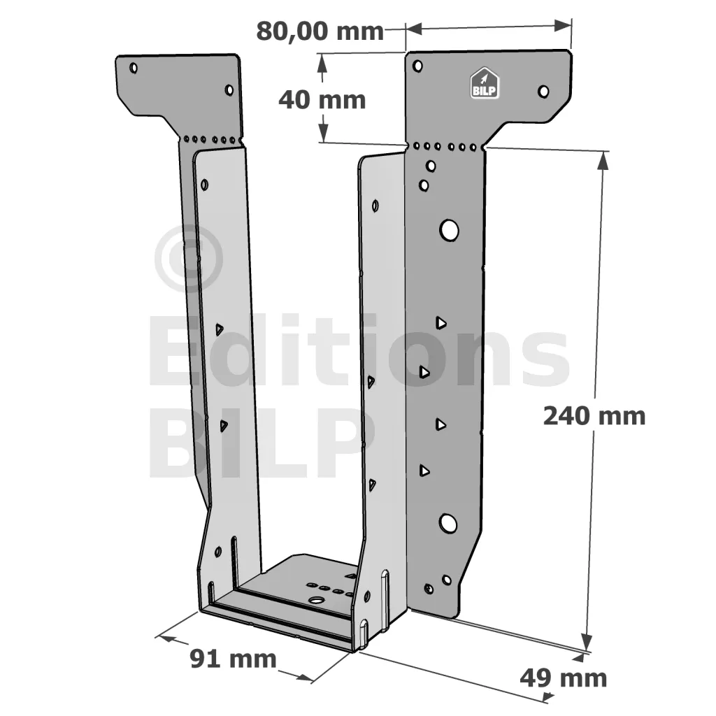 - Étrier fourni avec ses brides supérieures droites, pliables sur chantier afin de s’adapter à toutes les hauteurs de solives,