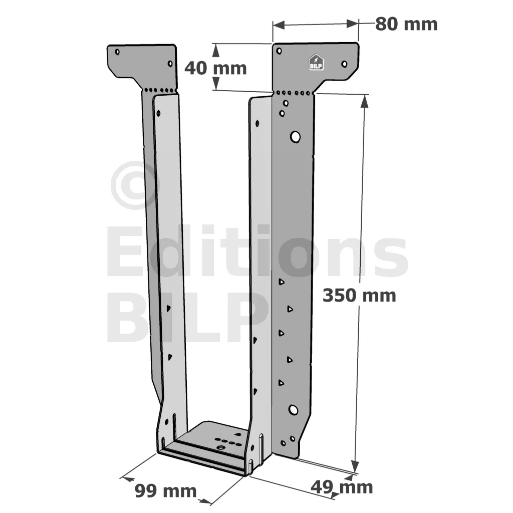 - Étrier fourni avec ses brides supérieures droites, pliables sur chantier afin de s’adapter à toutes les hauteurs de solives,