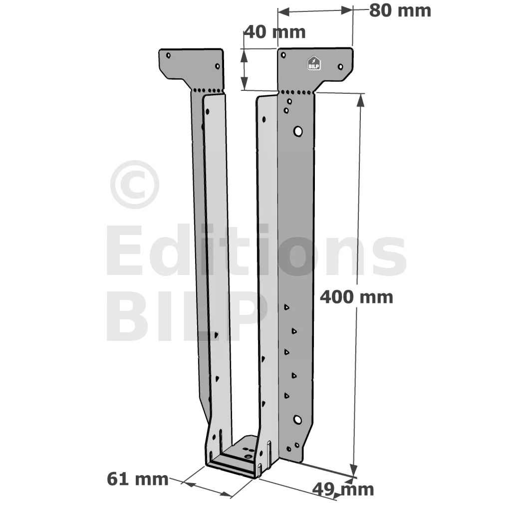 - Étrier fourni avec ses brides supérieures droites, pliables sur chantier afin de s’adapter à toutes les hauteurs de solives,