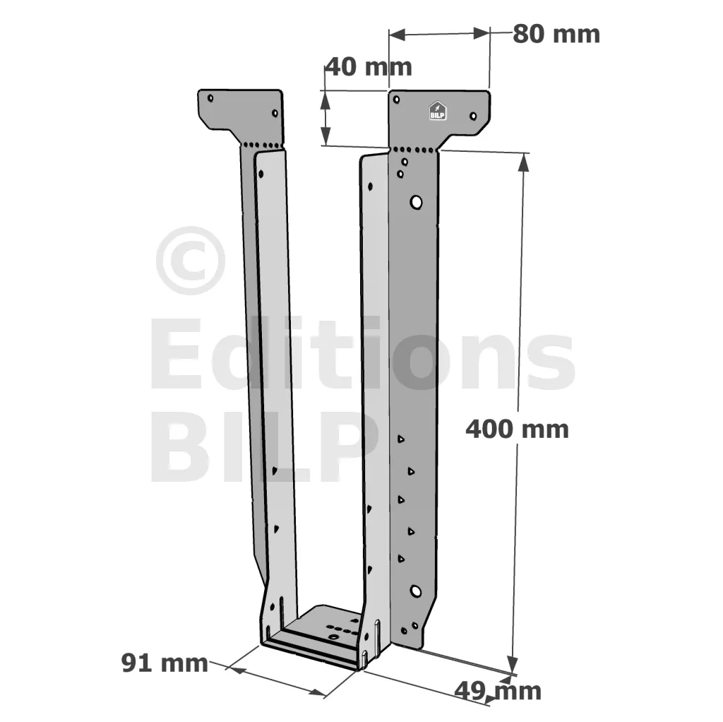 - Étrier fourni avec ses brides supérieures droites, pliables sur chantier afin de s’adapter à toutes les hauteurs de solives,