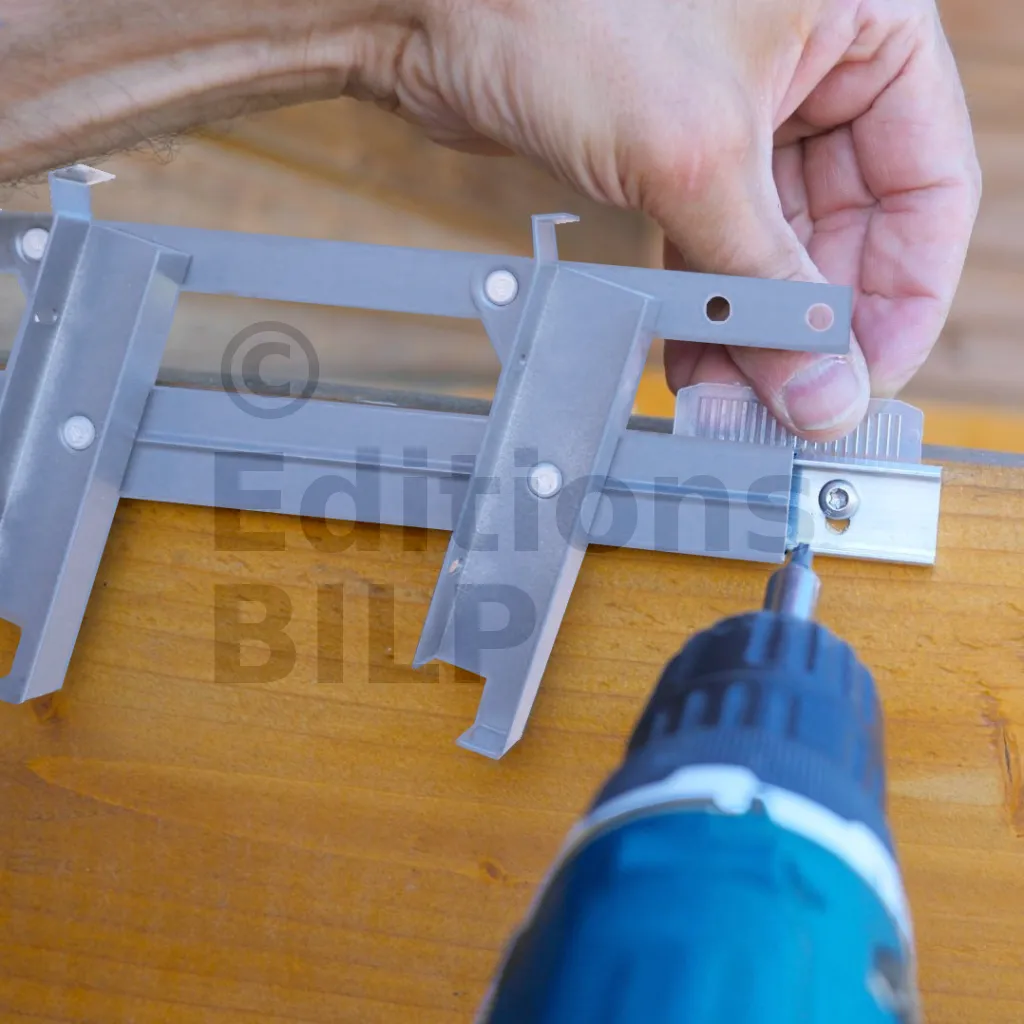 Distance entre les supports : À supposer que le mécanisme est fixé entre deux poutres, la distance entre ces deux poutres doit être égale à la longueur des lames + 35mm : 2 X 15mm (largeur du corps de mécanisme) + 5mm de jeu.