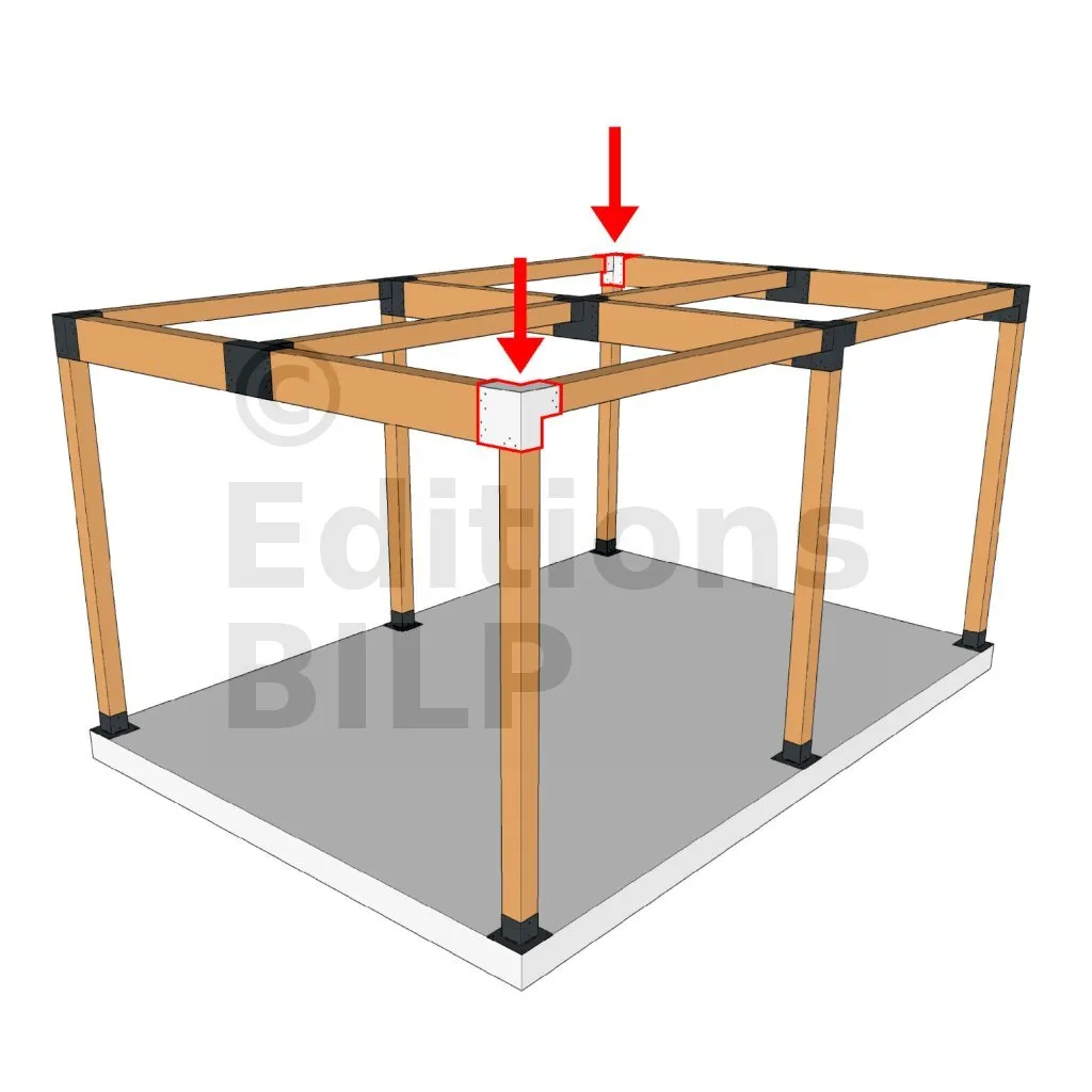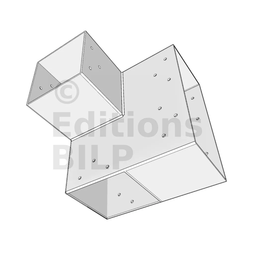 Il est utilisé dans un angle extérieur. Ce connecteur va permettre de raccorder une grosse poutre 240x120mm perpendiculairement à une poutre 120x120mm, le tout étant supporté par un poteau vertical 120x120 mm.