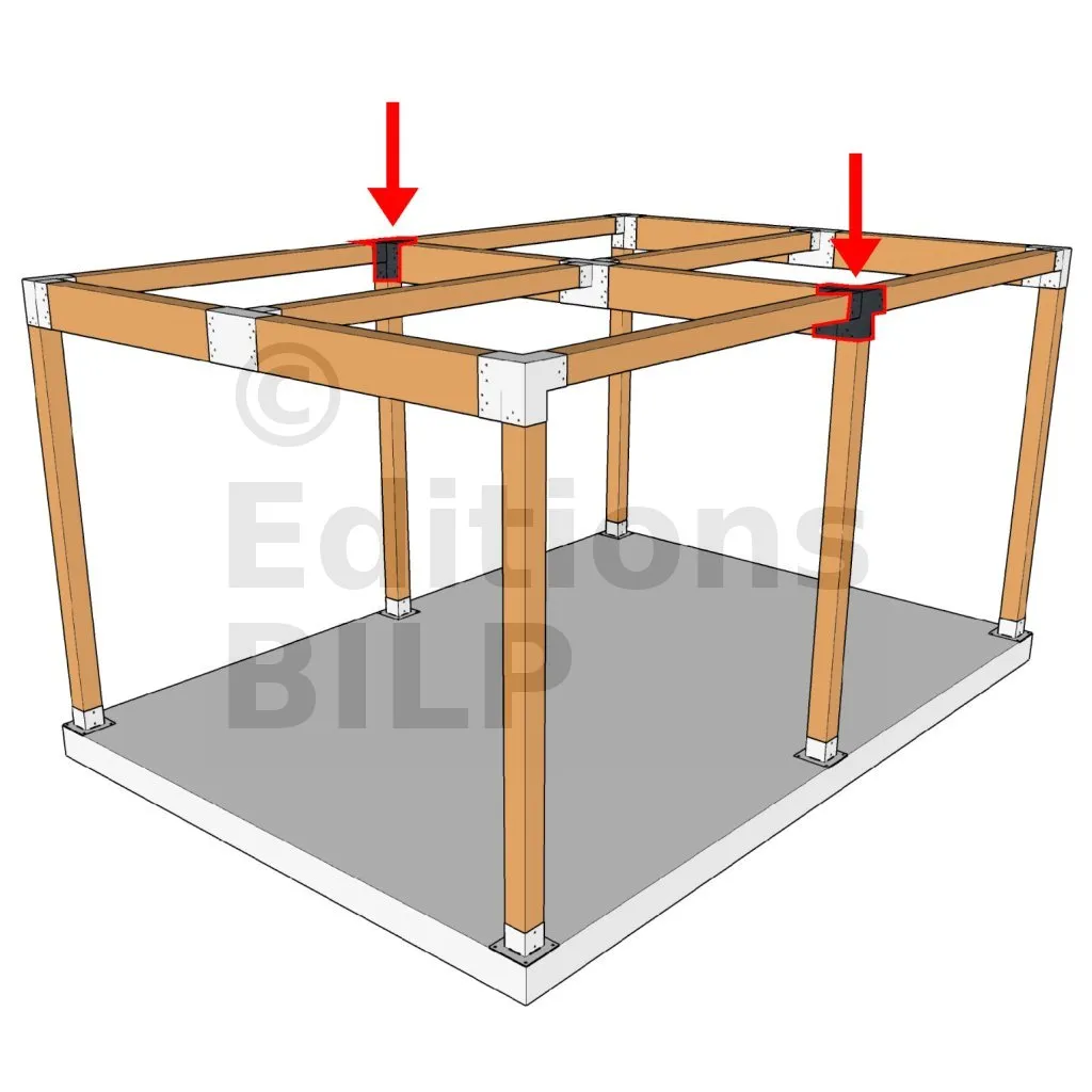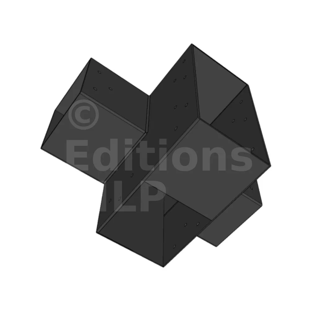 Il permet de raccorder deux poutres 120x120mm perpendiculairement à une grosse poutre 240x120mm, le tout étant supporté par un poteau vertical 120x120mm.