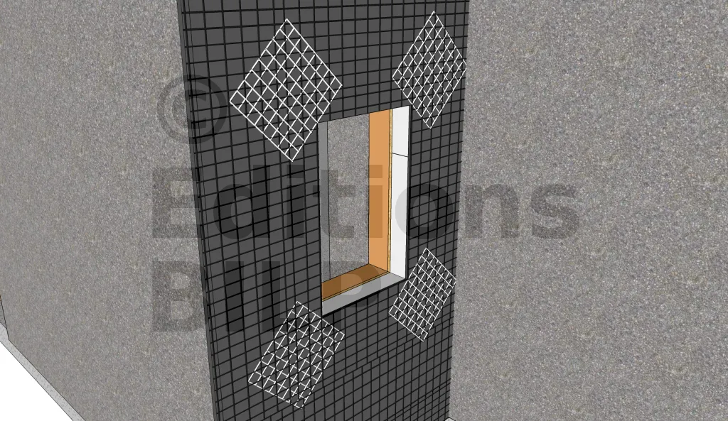 Au niveau de tous les angles des ouvertures, maroufler dans la couche d’accrochage des mouchoirs en treillis de fibre de verre de 35 x 35 cm positionnés en diagonale.