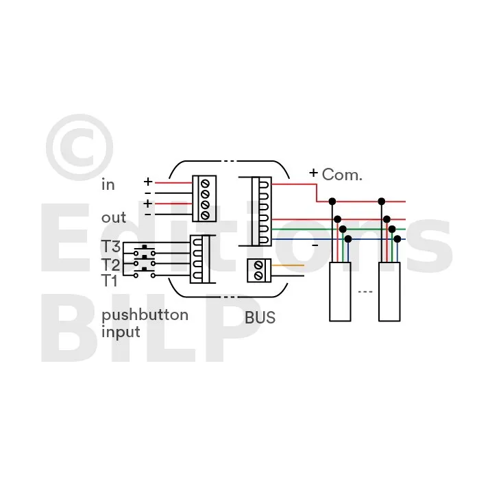 - Il est possible de réunir des dispositifs esclaves version BUS (maximum 40) pour répéter les fonctions du maître