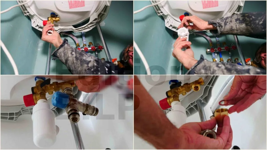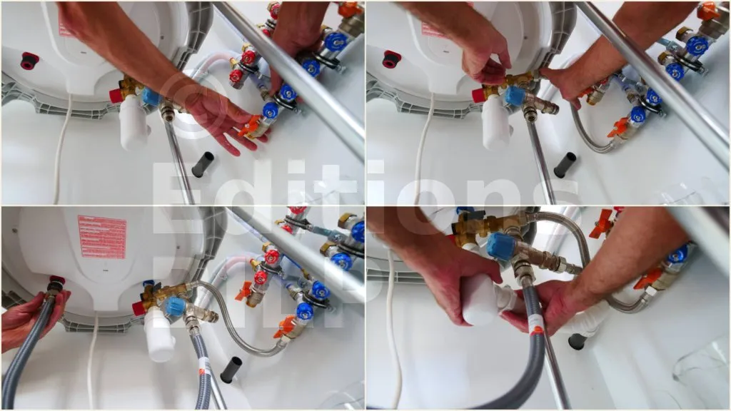 Présenter puis visser les flexibles entre le collecteur (vannes bleues/rouges) et le groupe de sécurité sous le ballon, en les alignant pour qu’ils ne se tordent pas. Côté arrivée d’eau froide, monter le raccord en T et le réducteur de pression, puis serrer sans forcer en maintenant le groupe pour ne pas le faire pivoter. Raccorder ensuite les flexibles au ballon : bleu égale entrée eau froide (via le groupe), rouge égale sortie eau chaude ; poser les joints et serrer modérément. Brancher l’évacuation du groupe sur un siphon avec une pente régulière, en s’assurant que le passage n’est pas bouché. Si possible, isoler les flexibles, puis rouvrir l’eau et vérifier qu’aucun raccord ne fuit.
