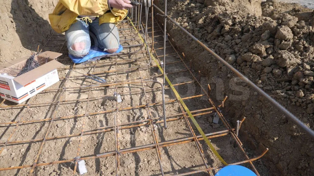 Les armatures d’attente du mur doivent être ancrées dans la semelle de fondation, c’est pourquoi il est nécessaire de les placer avant le coulage de la semelle. Elles doivent être espacées à des distances précises et régulières afin de faciliter la pose des blocs à bancher. En effet, les attentes doivent se trouver dans les alvéoles de chaque assise et ne doivent pas gêner la pose des blocs à bancher. Pour préserver la distance entre les attentes, nous les avons attachés à l’armature de la semelle (treillis soudé) et fixées avec des barres d’acier sur la tête des attentes.