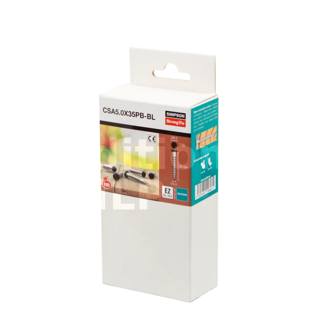 Les vis CSA5.0x40ZPB ont été étudiées pour la mise en œuvre discrète des équerres et des connecteurs en finition noire. Leur tête conique assure un contact complet avec le connecteur. L’empreinte étoile permet de maintenir la vis lors du montage.