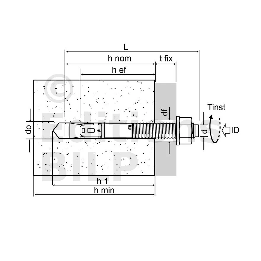 | Références | Dimensions [ØxL] | ID1) | Epaisseur de la pièce à fixer [tfix] | Ø perçage [d0] | Prof. mini de perçage [h1] | Profondeur d’ancrage [hef] | Ø perçage dans pce à fixer [df] | Ep. mini du support [hmin] | Couple de serrage [Tinst] | Ouverture de clé sur plat [SW] | Qté par boîte |