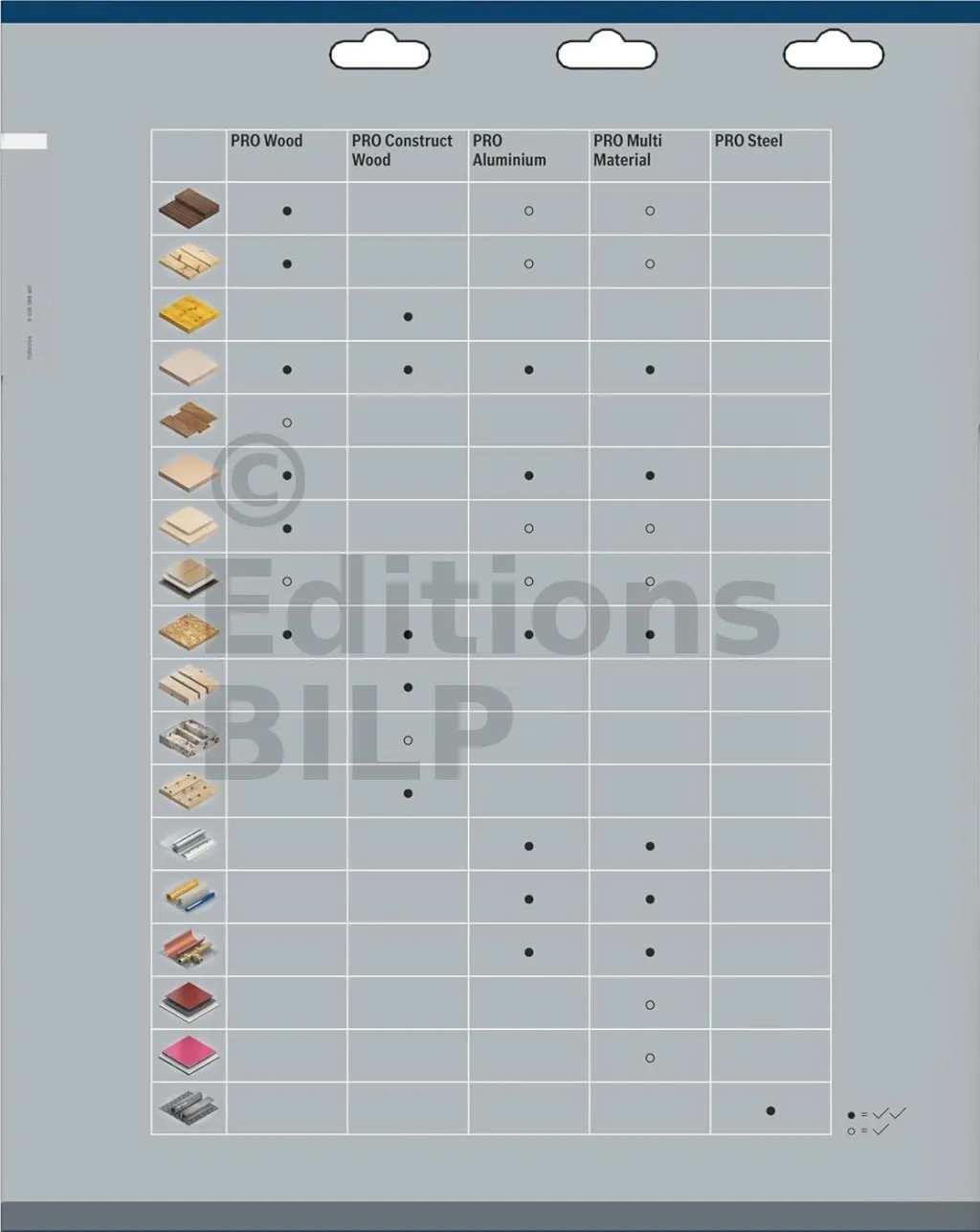 Pour la colonne PRO Multi-Matériaux, les matériaux compatibles avec la lame sont ceux mentionnés dans le chapitre Caractéristiques. Les matériaux pouvant être découpés mais de manière moins optimale sont le bois dur, le bois résineux, les panneaux plastifiés et le HPL stratifié haute pression.