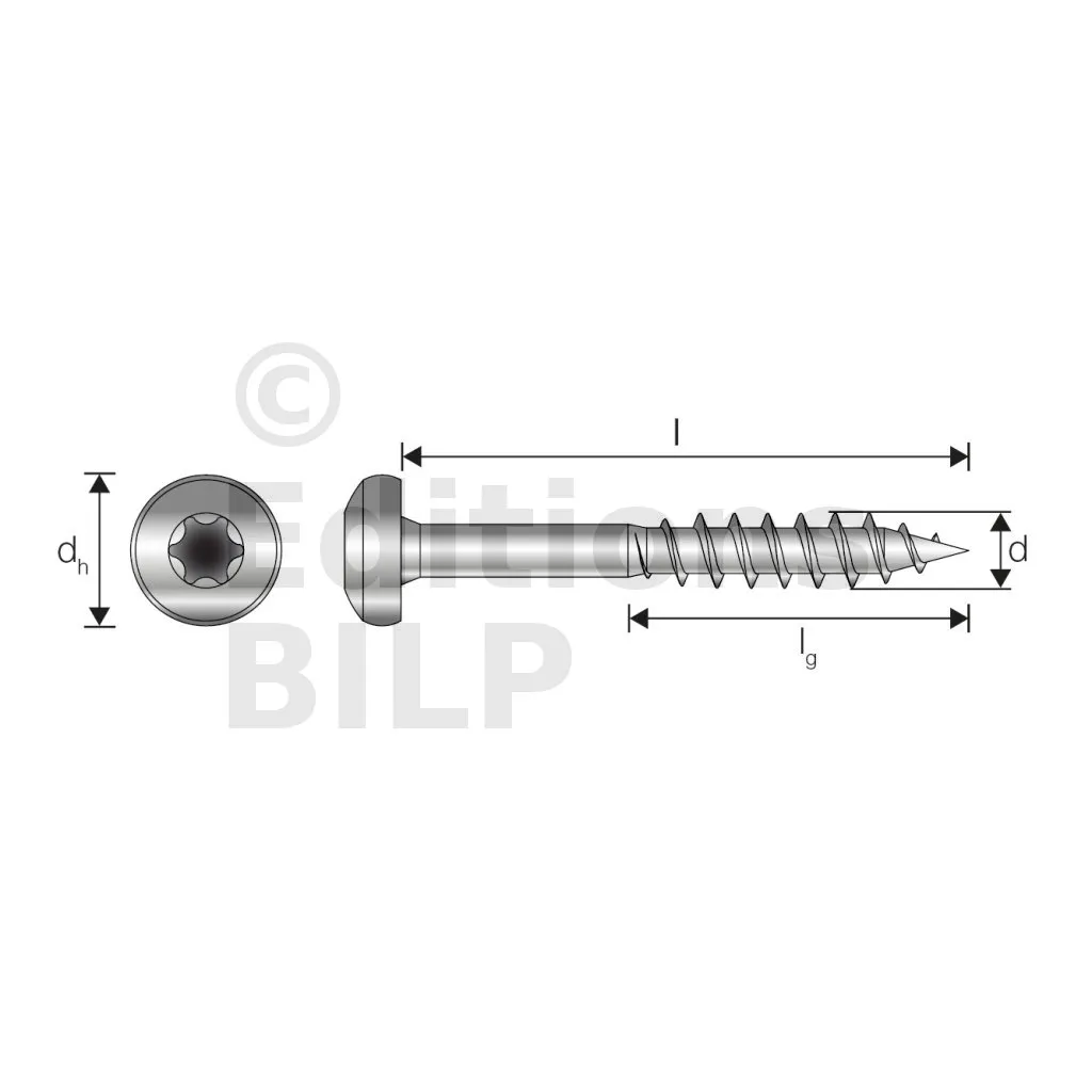 Vis bois tête bombée (fixation d’élément ACIER sur BOIS) - 4.0x30mm - INOX A2 - Réf. 77923