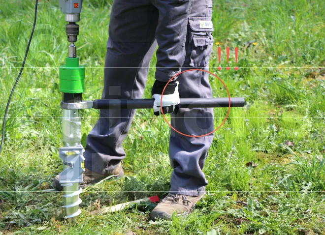 - La poignée permet à l’utilisateur de saisir l’outil fermement et d’appliquer le couple nécessaire pour visser la vis de fondation dans le sol. Sans une bonne poignée, il serait difficile d’exercer la force nécessaire pour enfoncer la vis.