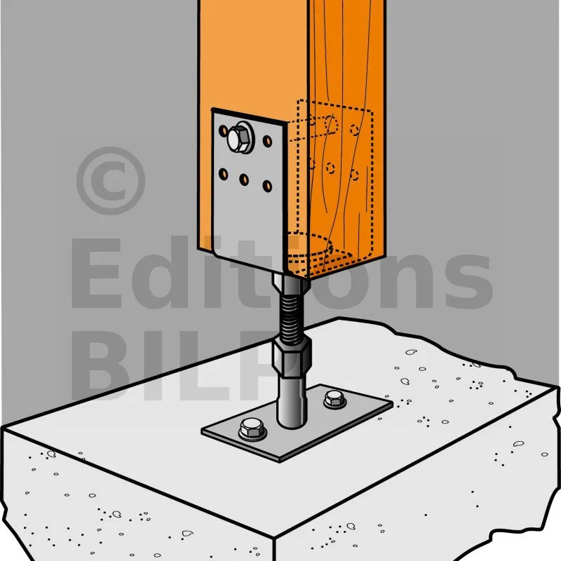 ** Référez-vous à la gamme d’ancrage Simpson Strong-Tie pour sélectionner l’ancrage adapté. Les solutions standards sont BOAXII, SET-XP, WA, AT-HP, à choisir en fonction du type de béton, de l’entraxe et des distances aux bords.