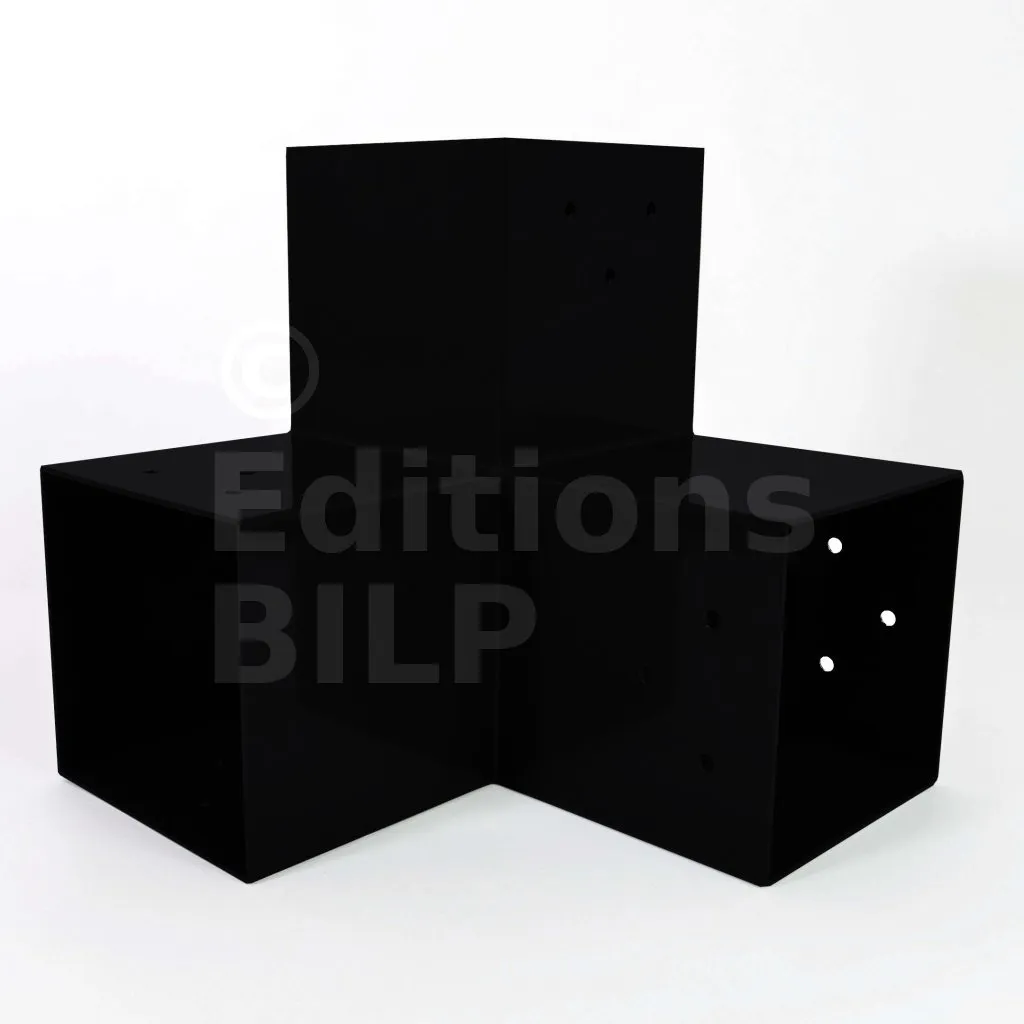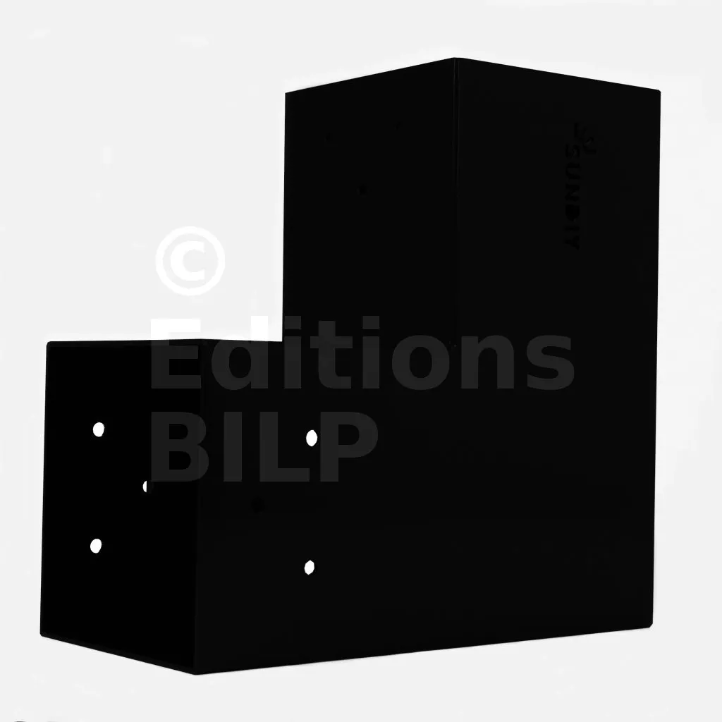 Il est utilisé dans un angle extérieur. Ce connecteur va permettre de raccorder une poutre 90x90mm perpendiculairement à une poutre 90x90mm, le tout étant supporté par un poteau vertical 90x90mm.