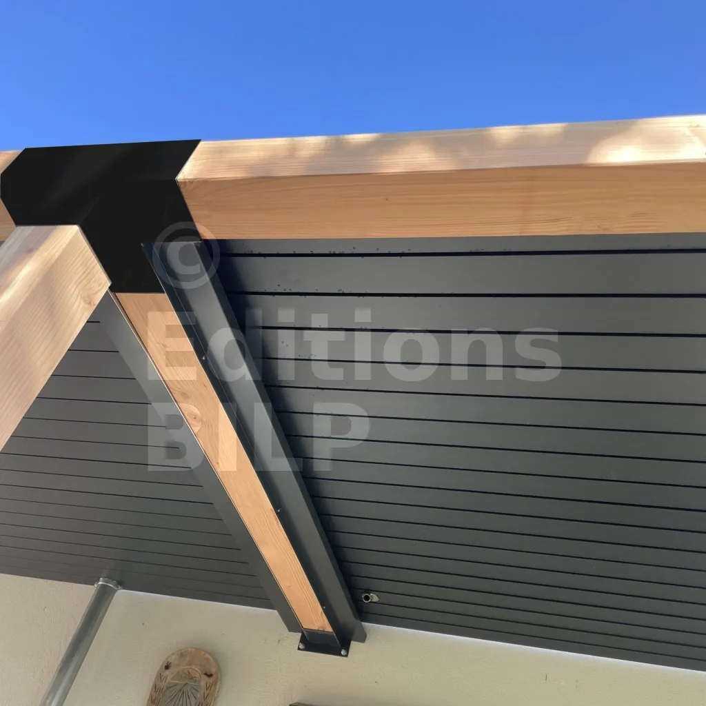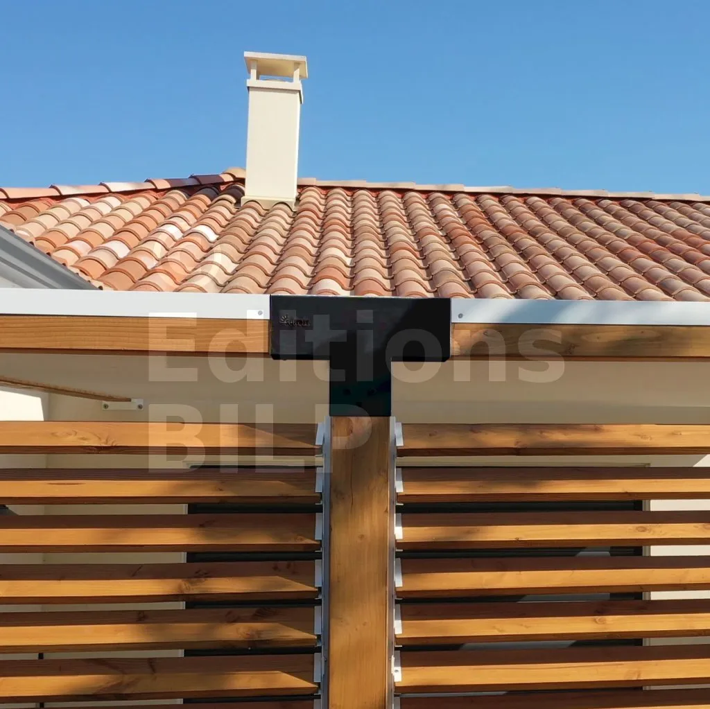 Il permet de raccorder une poutre de 90x90mm perpendiculairement à un chevron de 90x90mm, le tout étant supporté par un poteau vertical de 90x90mm.