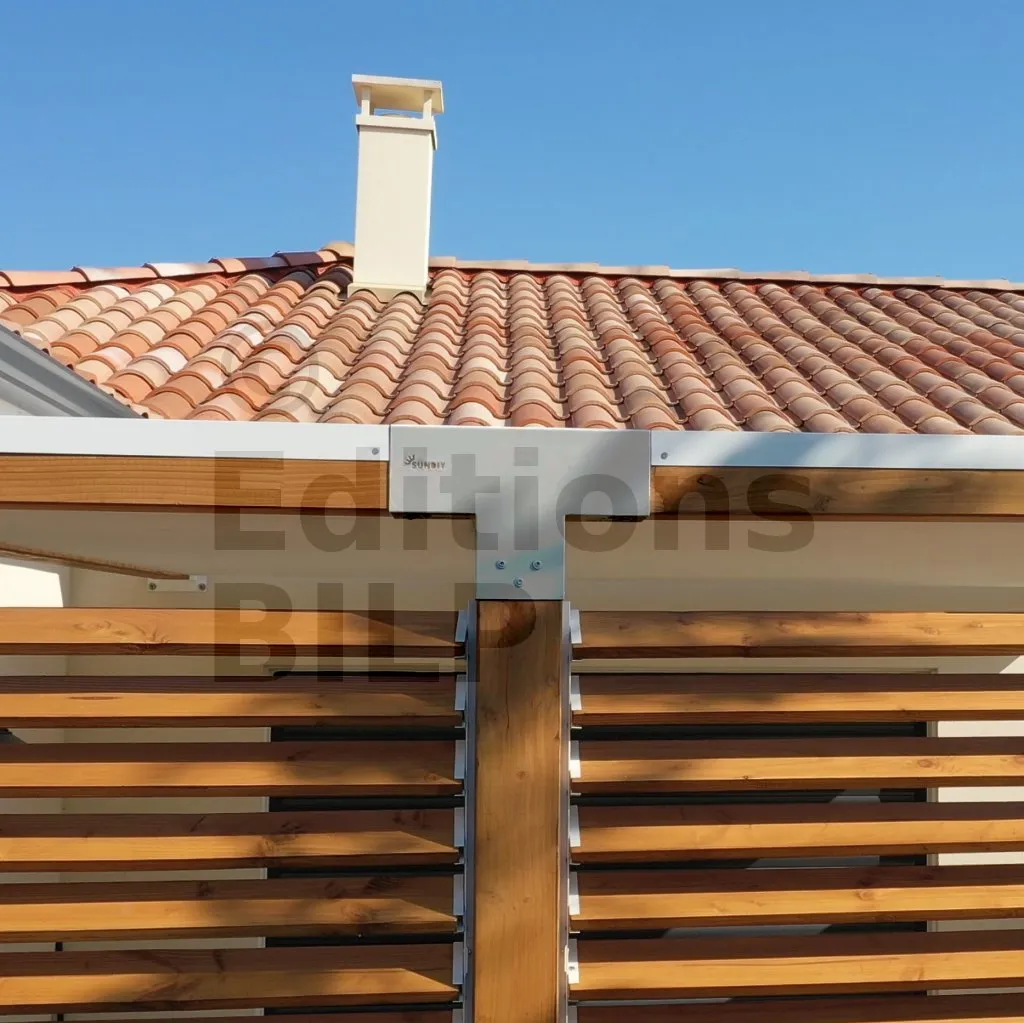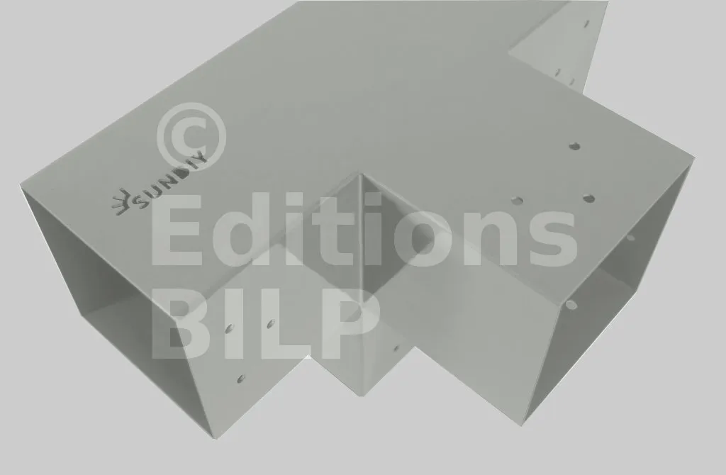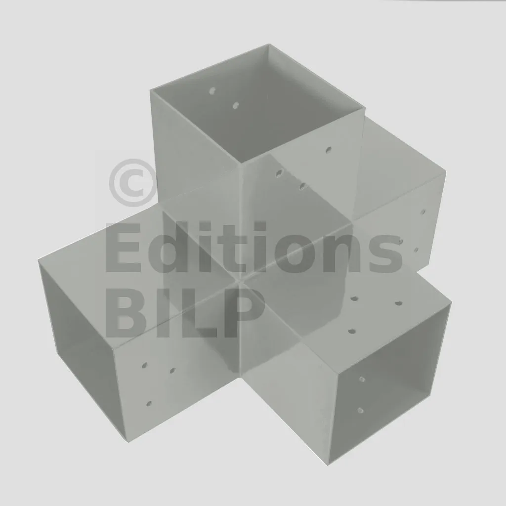 Il permet de raccorder une poutre de 90x90mm perpendiculairement à un chevron de 90x90mm, le tout étant supporté par un poteau vertical de 90x90mm.