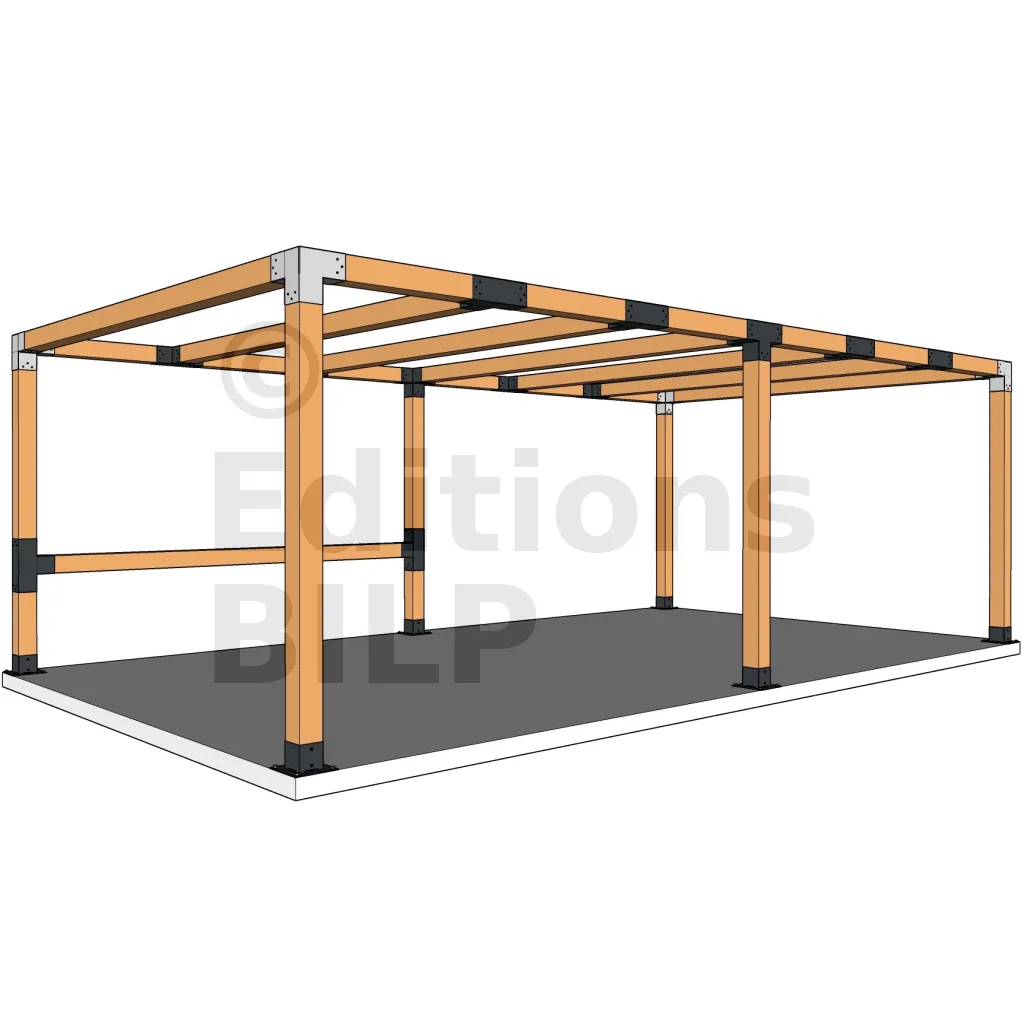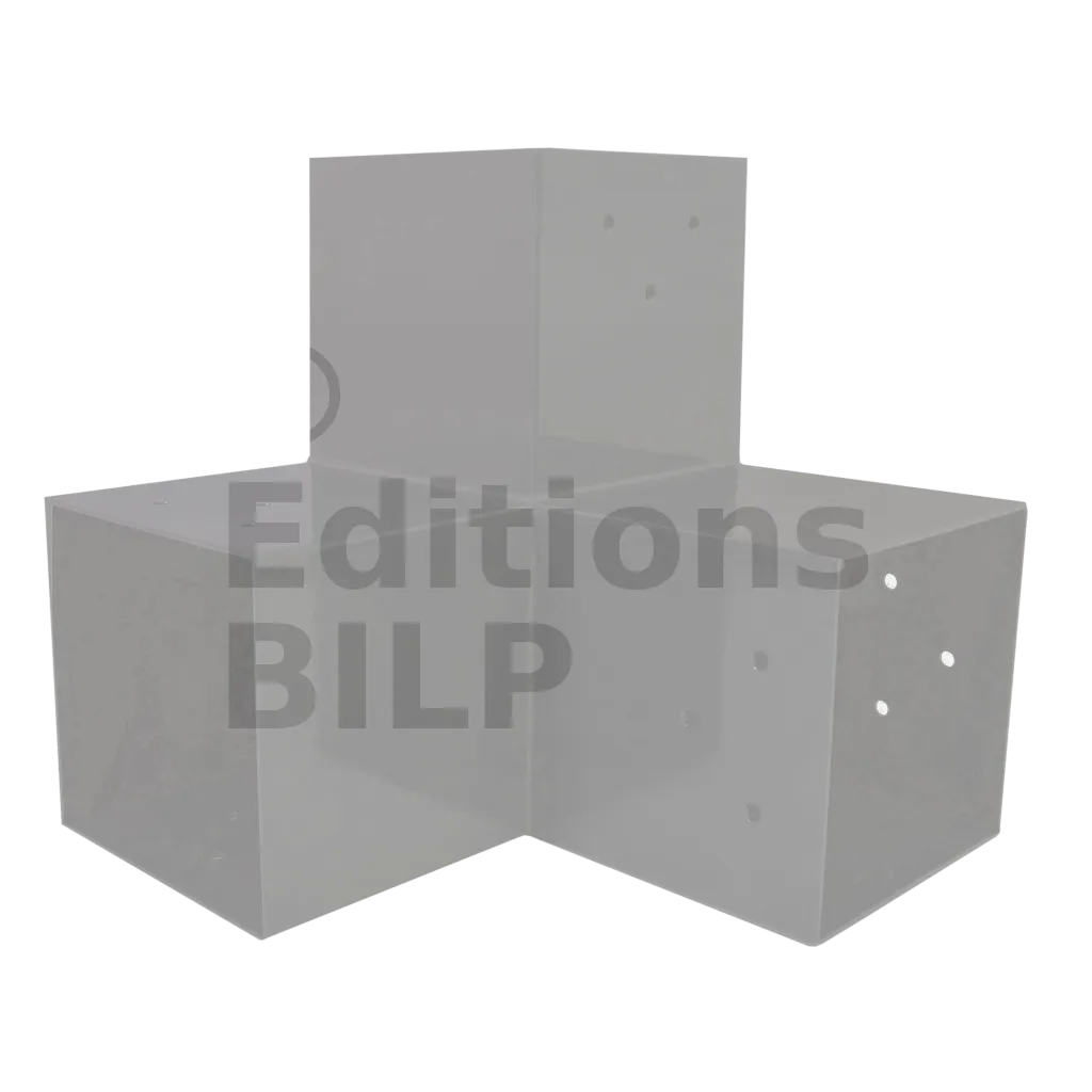 Il est utilisé dans un angle extérieur. Ce connecteur va permettre de raccorder une grosse poutre 120x120mm perpendiculairement à une poutre 120x120mm, le tout étant supporté par un poteau vertical 120x120mm.