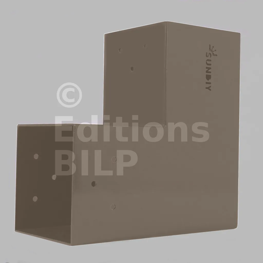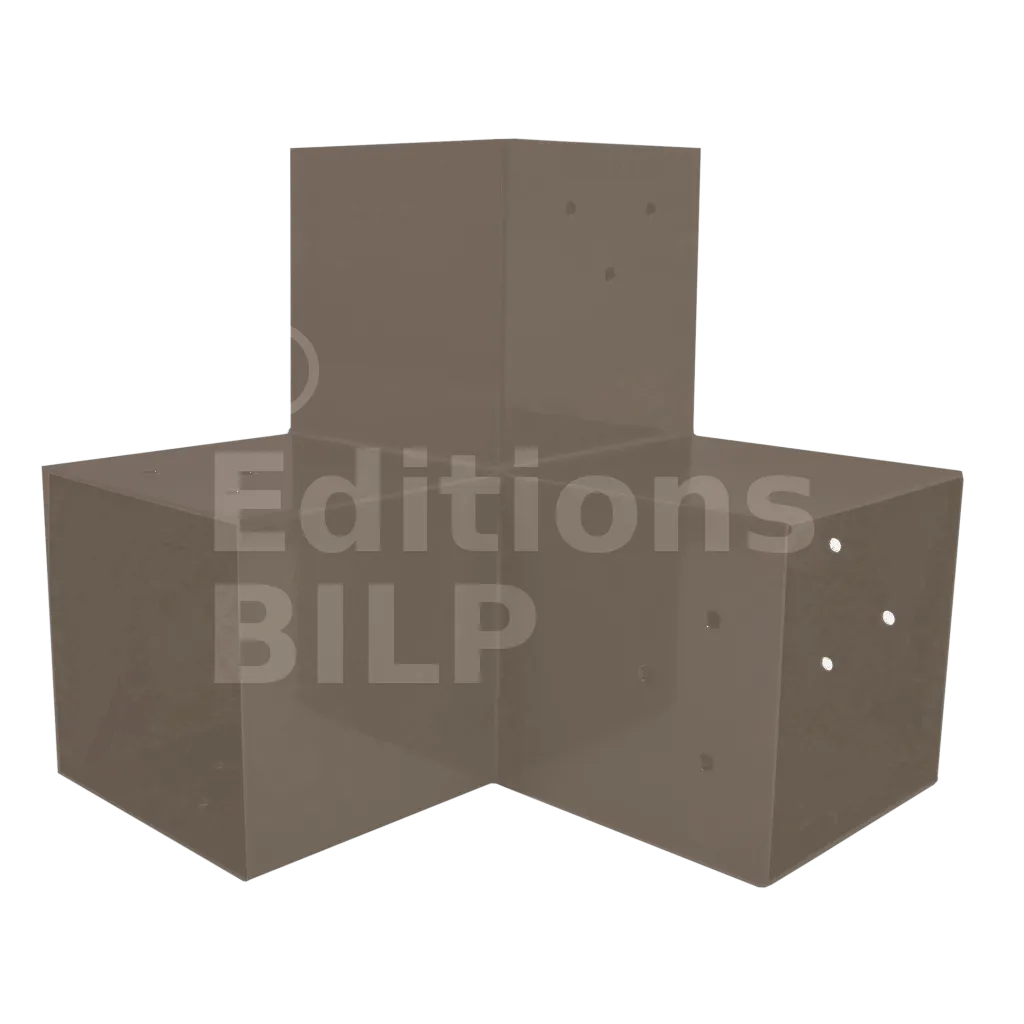 Il est utilisé dans un angle extérieur. Ce connecteur va permettre de raccorder une grosse poutre 120x120mm perpendiculairement à une poutre 120x120mm, le tout étant supporté par un poteau vertical 120x120mm.