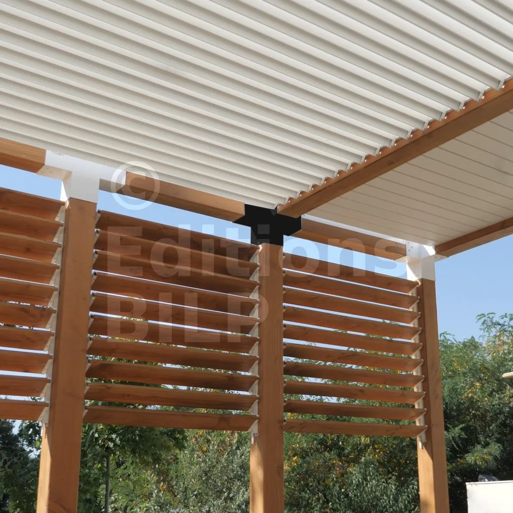 Il permet de raccorder une poutre de 120x120mm perpendiculairement à un chevron de 120x120mm, le tout étant supporté par un poteau vertical de 120x120mm.