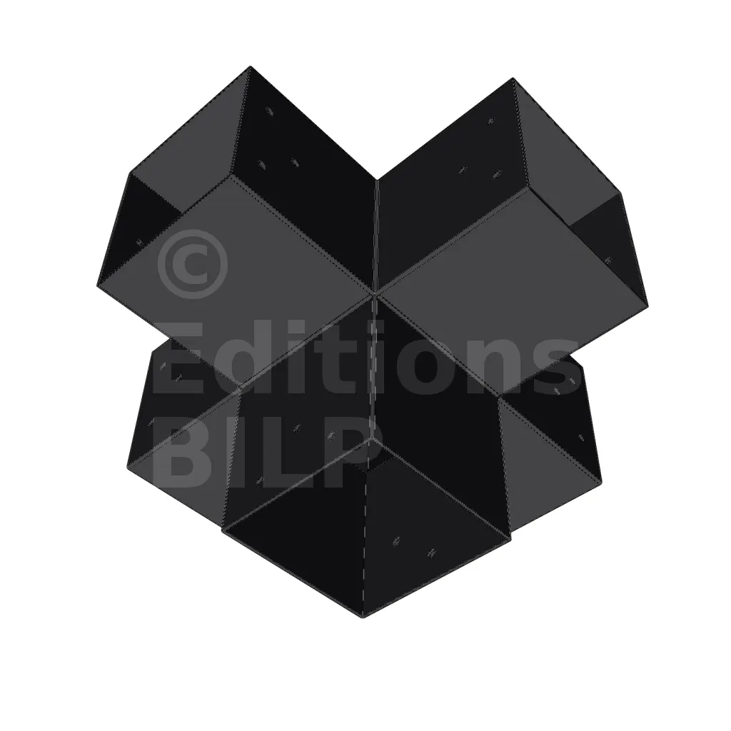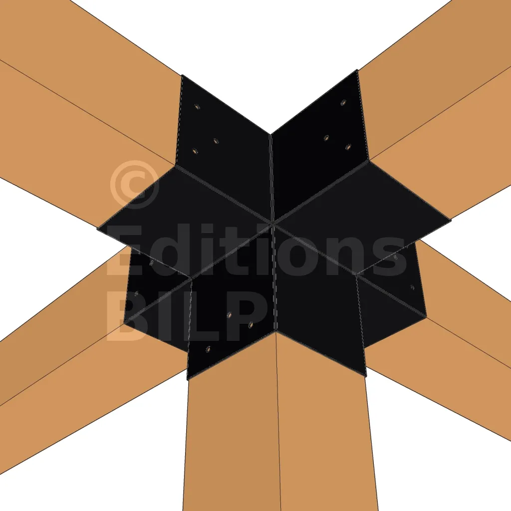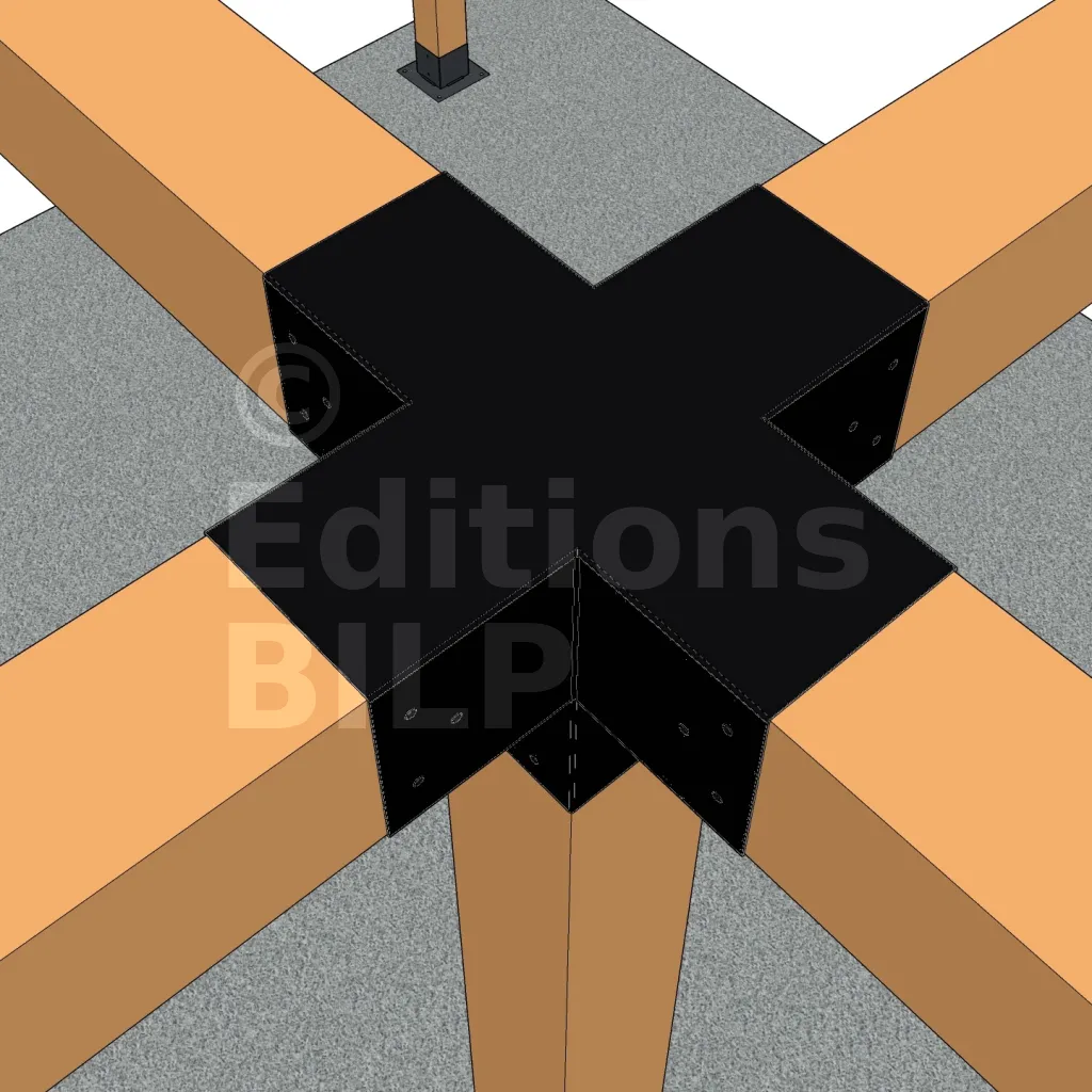 Il permet de raccorder deux poutres 120x120mm perpendiculairement à une autre poutre 120x120mm, le tout étant supporté par un poteau vertical de 120x120mm.