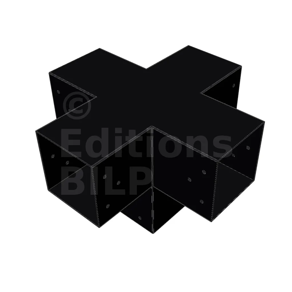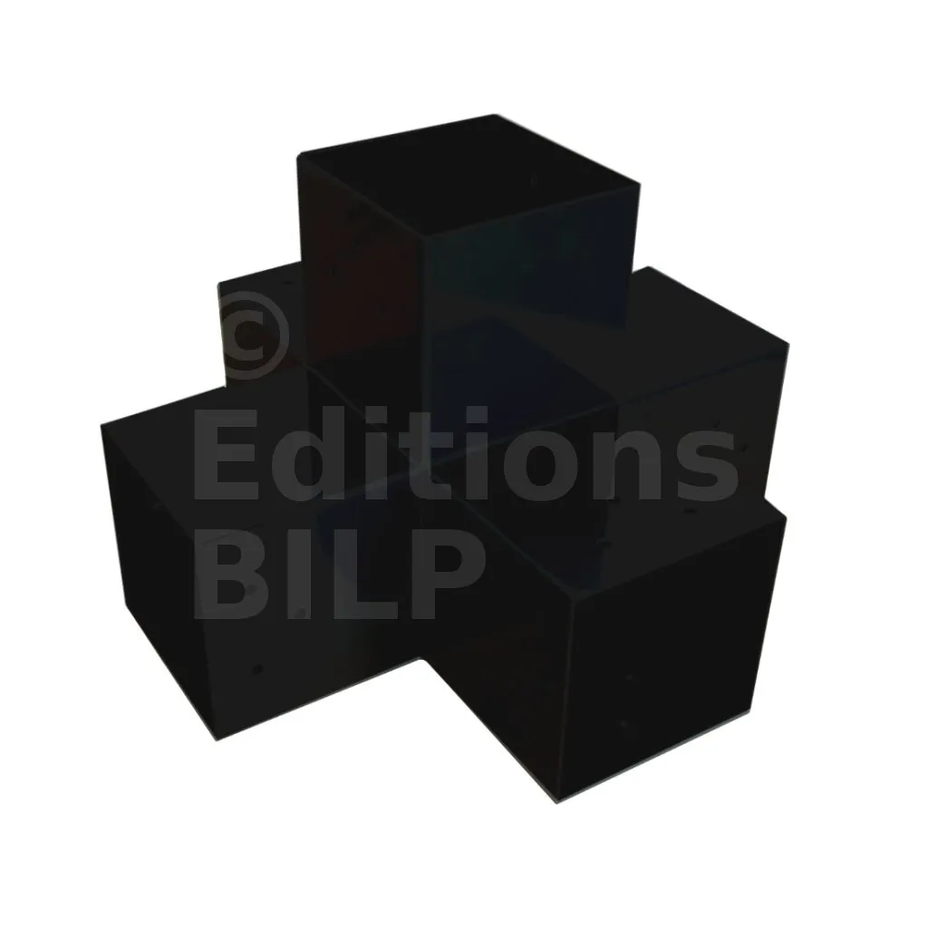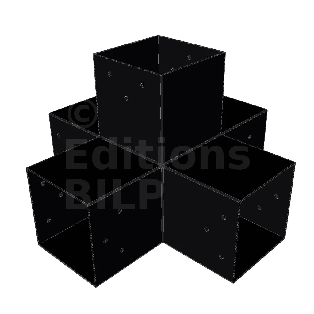 Il permet de raccorder deux poutres 120x120mm perpendiculairement à une autre poutre 120x120mm, le tout étant supporté par un poteau vertical de 120x120mm.