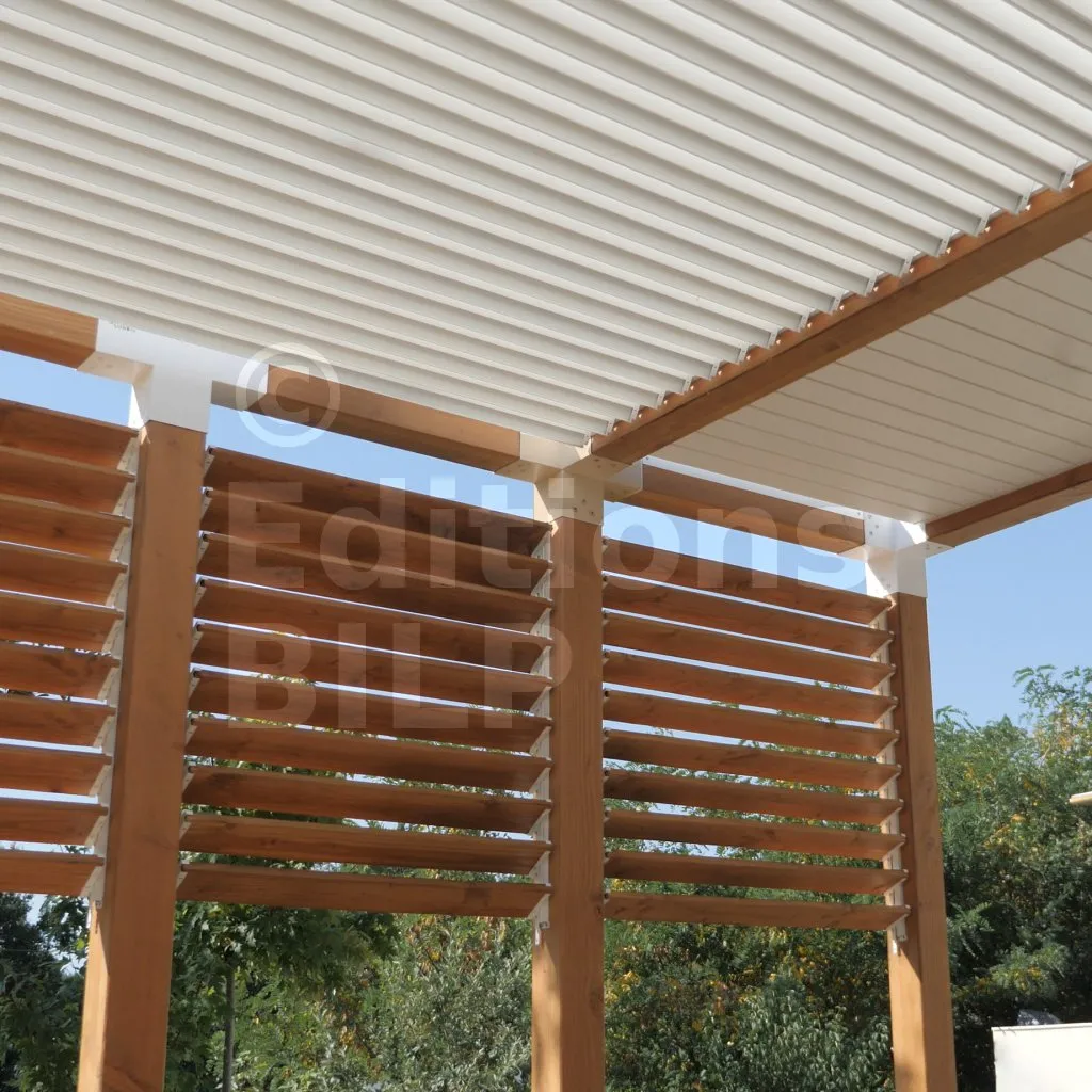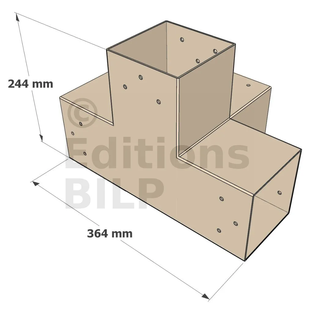 Il permet de raccorder une poutre de 120x120mm perpendiculairement à un chevron de 120x120mm, le tout étant supporté par un poteau vertical de 120x120mm.