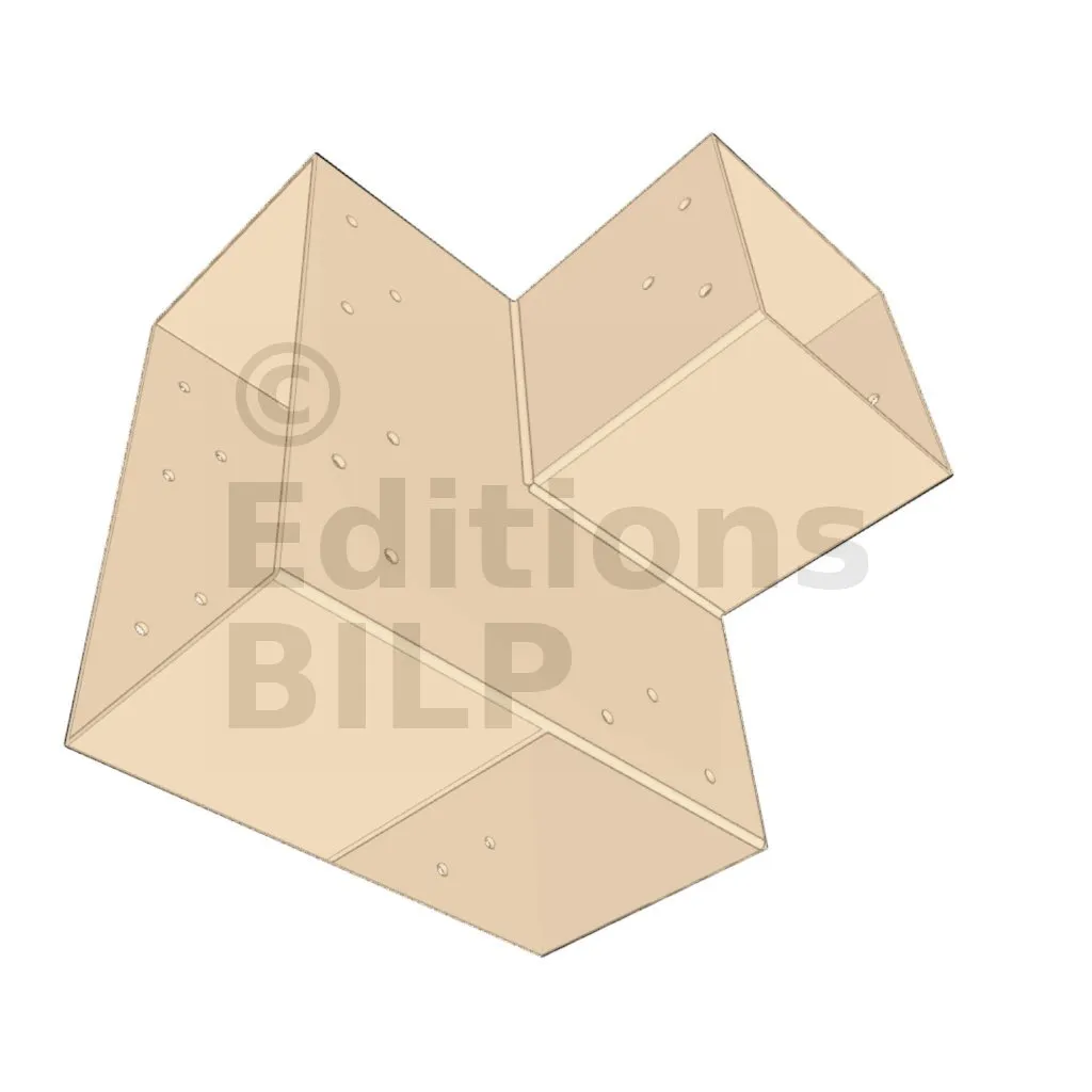 Il est utilisé dans un angle extérieur. Ce connecteur va permettre de raccorder une grosse poutre 240x120mm perpendiculairement à une poutre 120x120mm, le tout étant supporté par un poteau vertical 120x120mm.