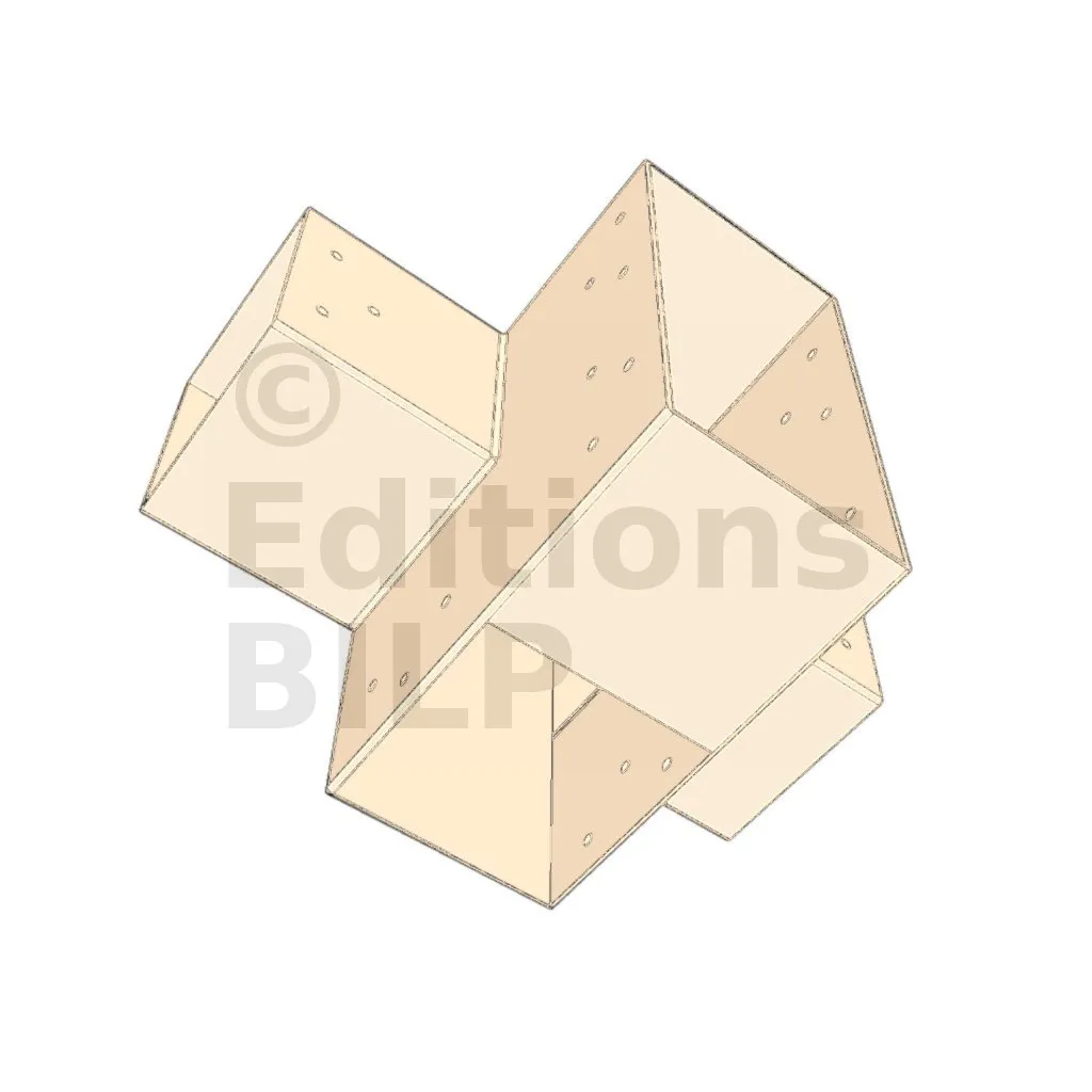 Il permet de raccorder deux poutres 120x120mm perpendiculairement à une grosse poutre 240x120mm, le tout étant supporté par un poteau vertical 120x120mm.