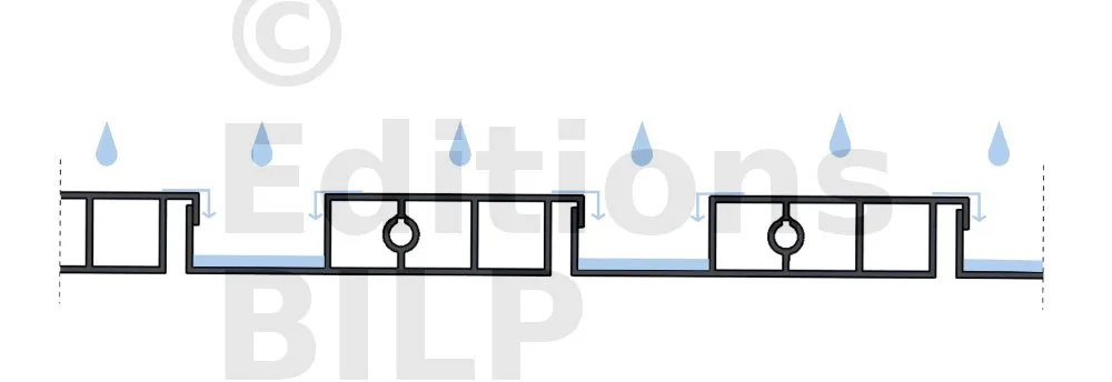 L’eau est collectée dans la rigole intégrée à la lame. Sous l’effet de la gravité, elle s’écoule ensuite de part et d’autre à chaque extrémité de la lame. Si vous recherchez une étanchéité totale, nous vous conseillons d’ajouter des chenaux qui viendront récupérer l’eau à chaque extrémité et la rediriger vers l’extérieur.