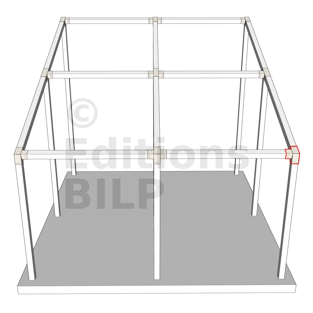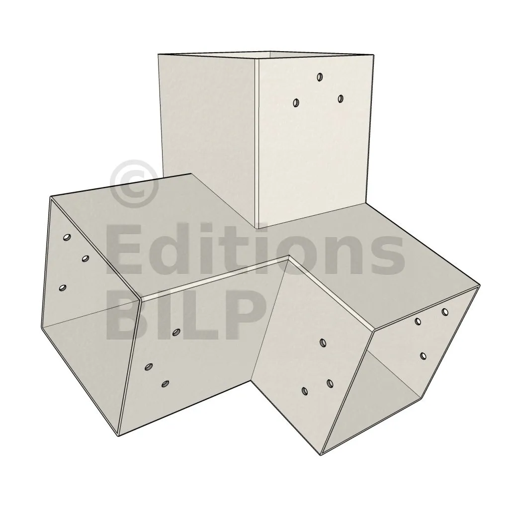 Il est utilisé dans un angle extérieur. Ce connecteur va permettre de raccorder une poutre 120x120mm à une poutre 120x120mm avec une pente de 20°, le tout étant supporté par un poteau vertical 120x120mm.