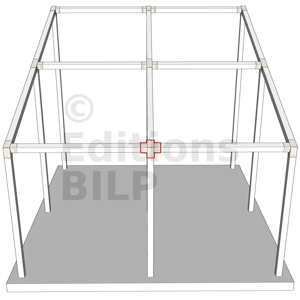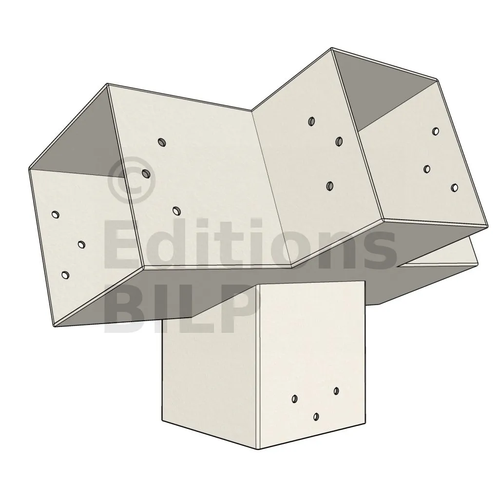 Connecteur d’angle intérieur à quatre directions conçu pour l’assemblage de poutres en section 120x120 mm avec un chevron de même section incliné à 20°. Il assure la jonction structurelle entre les éléments horizontaux, le chevron incliné et un poteau porteur vertical en 120x120 mm.